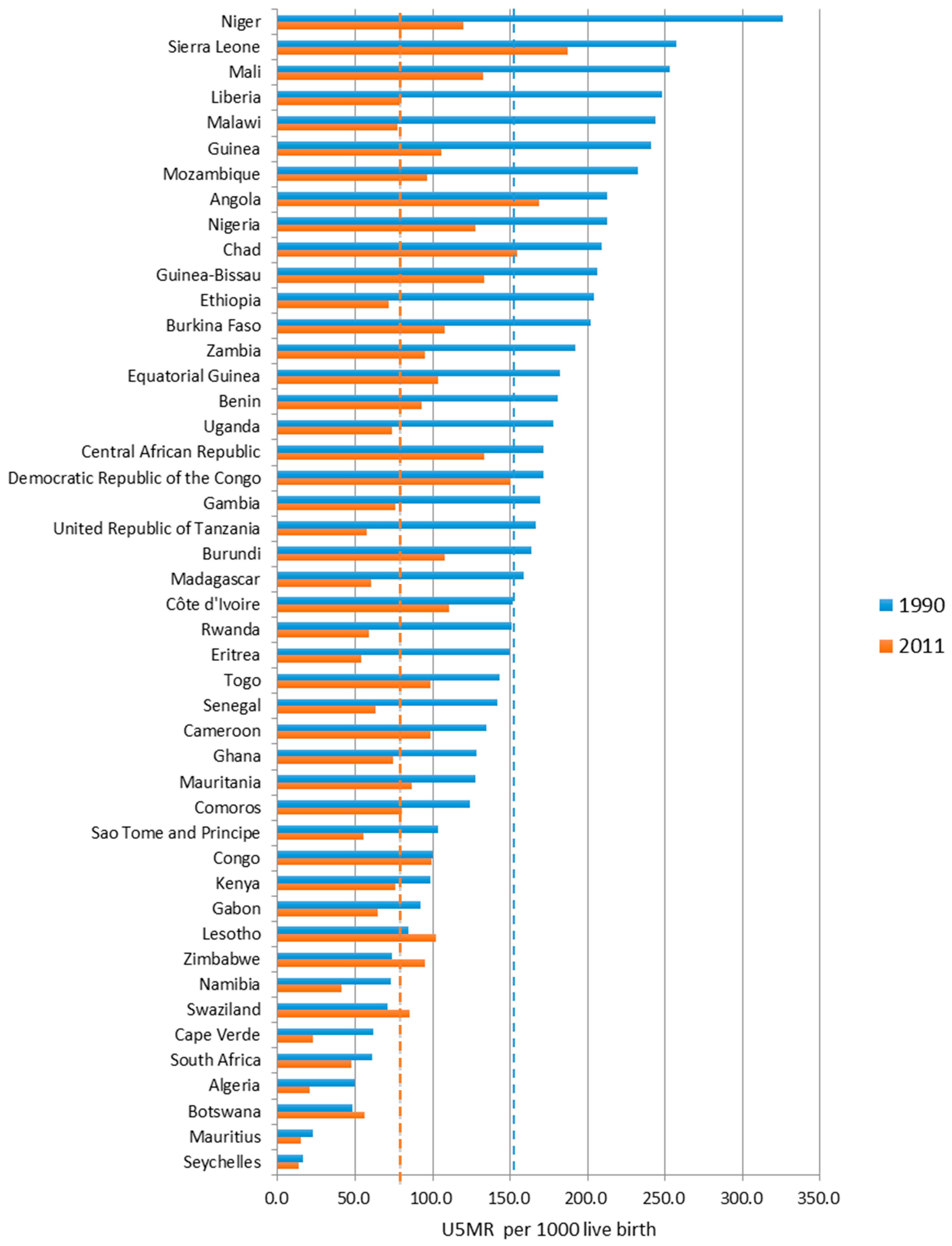 The variation for U5MR of African countries, between 1990 and 2011. (1) In figure, the red dotted line is the average value for 2011, 87.54 per 1000 liver birth, while the blue dotted line represent the average value for 1990, 151.97 per 1000 liver birth; (2) The countries were sorted by U5MR for 1990.