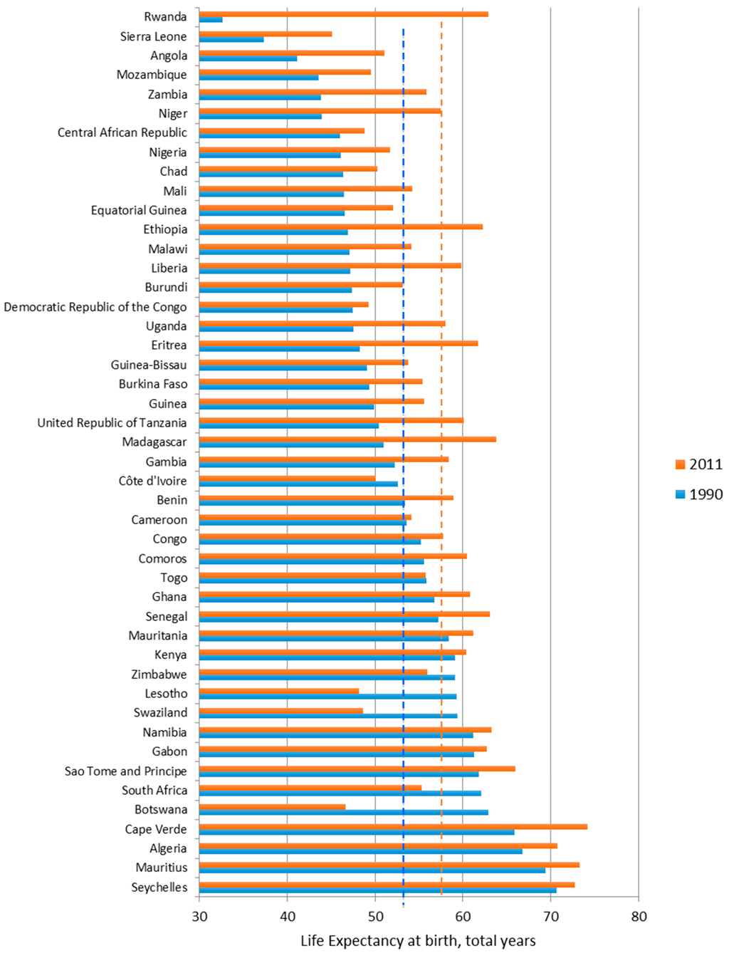 Life Expectancy of African countries, 1990 and 2011. (1) In figure, the red dotted line is the average value for 2011, 57.49 year old, while the blue dotted line represent the average value for 1990, 52.73; (2) The countries were sorted by LE for 1990.
