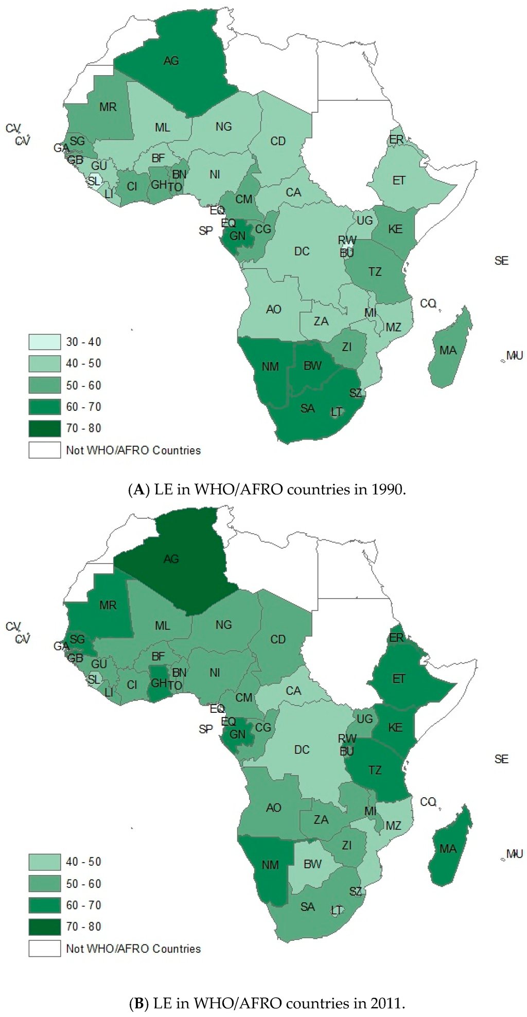 Comparing the variation of LE of Africa Countries, (A) 1990 and (B) 2011, by GIS. This figure showed the variation of LE by GIS.