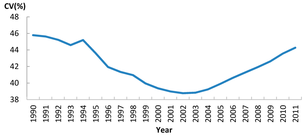 Although U5MR was declining steadily in Sub-Saharan Africa as a whole region, variations between the 46 Africa countries, in terms of CV, showed a “U” shape curve (Figure 7). This meant that for the first decade of the study period, variations between countries became smaller, indicating a sigma convergence. However, after 2002, the trend moved in the opposite direction, suggesting that variations between countries were getting greater. In other words, there was no continuous sigma convergence of U5MR in Africa from 1990 to 2011 (Figure 7).