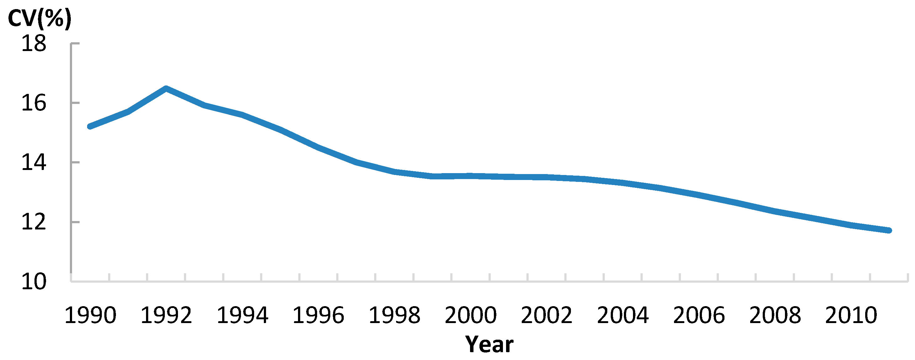 The trend of Coefficient of Variation for U5MR in Africa, 1990–2011.