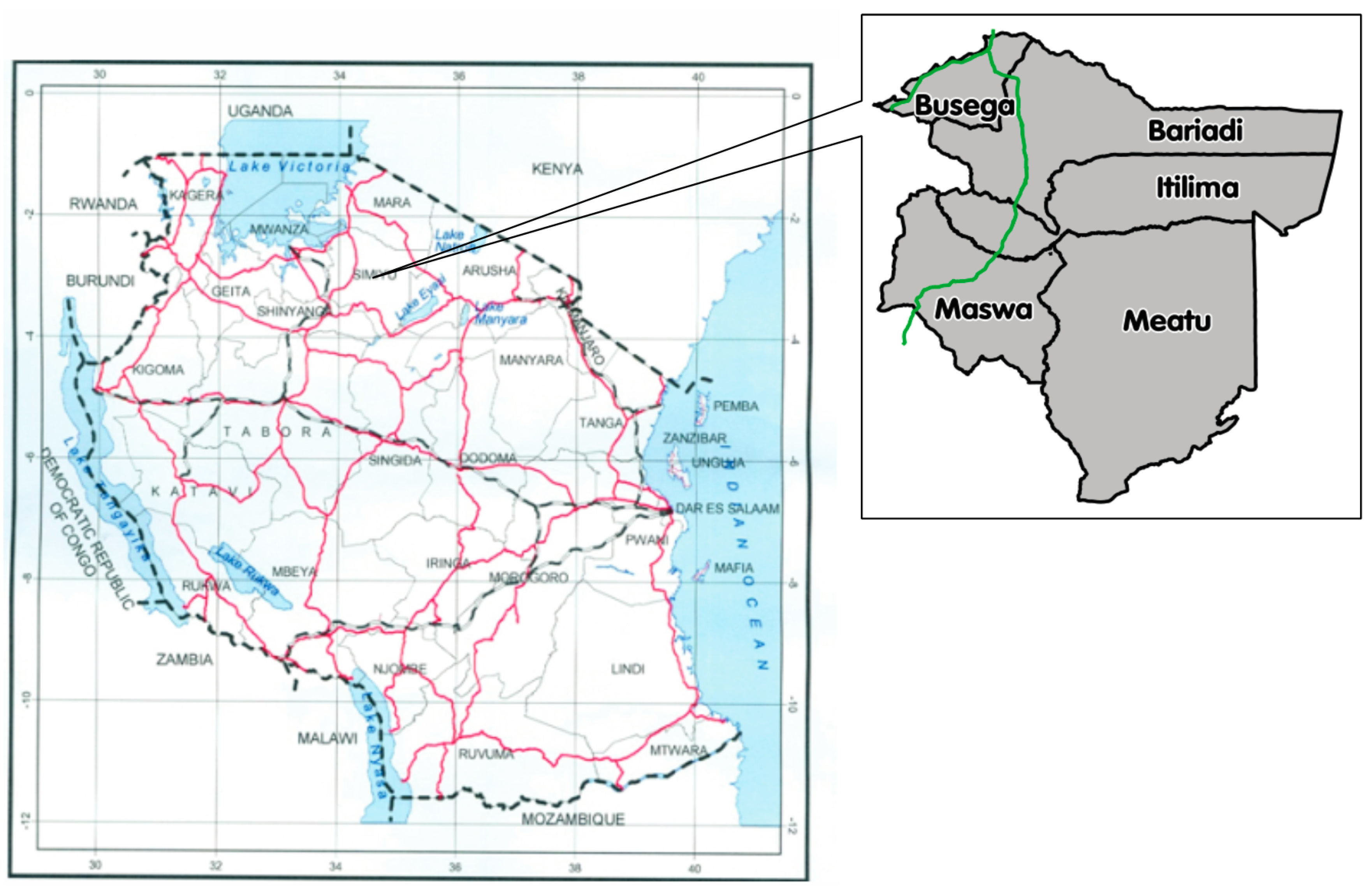 Figure 1 below is the map of Tanzania, on the left it depicts clearly Simiyu region’s administrative boundaries while the small map on the right depicts Simiyu regions’s five districts.