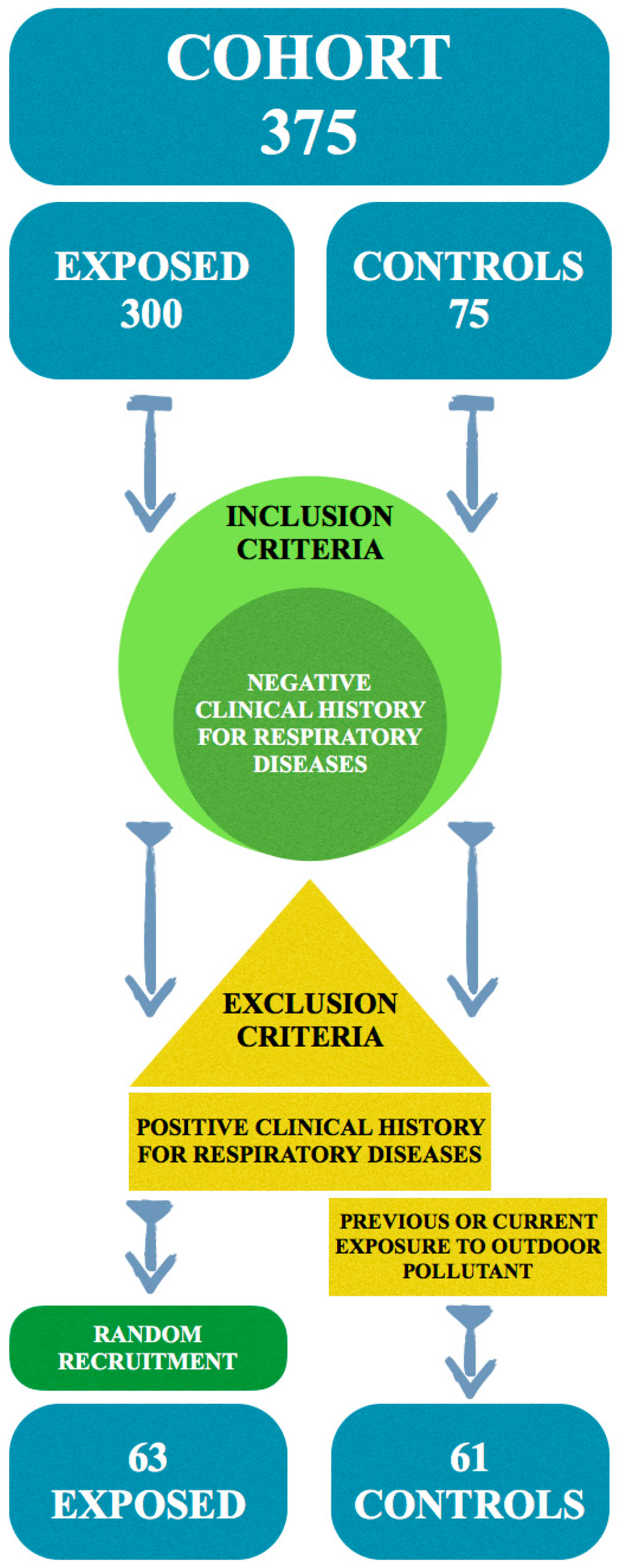 The response rate was higher for exposed (94%) than for controls (91%). All recruited subjects, both exposed and non-exposed, had a negative clinical history for previous respiratory diseases (inclusion criteria); only for non-exposed subjects did we adopt as exclusion criteria previous or current occupational exposure to outdoor pollutants. The final sample consisted of a total of 124 subjects, 63 exposed and 61 controls (Figure 1). The investigation was carried out over a period from July to November 2013, and the two groups were studied at the same time to eliminate any confounding factor introduced by seasonal variations. The waste disposal activities of the exposed workers were carried out 5 days a week for 6 h/day and consisted of emptying different-sized containers (wheely-bins, dumpsters) manually or mechanically with waste compactors, sometimes with ground assistance from the mechanised refuse collection service. Informed consent was obtained from all subjects before inclusion in the study. All subjects agreed to the processing of their personal data, treated as sensitive data. All subjects were informed that data from the research protocol would be processed anonymously and collectively, applying proper scientific methods and for scientific purposes, in accordance with the principles of the Helsinki Declaration. Our study is in accordance with good clinical practice guidelines. Both spirometric and questionnaire were performed in agreement with the health surveillance protocol and health promotion’s campaigns (Italian Legislative Decree N° 81 of 2008, in transposition of several European Directives).