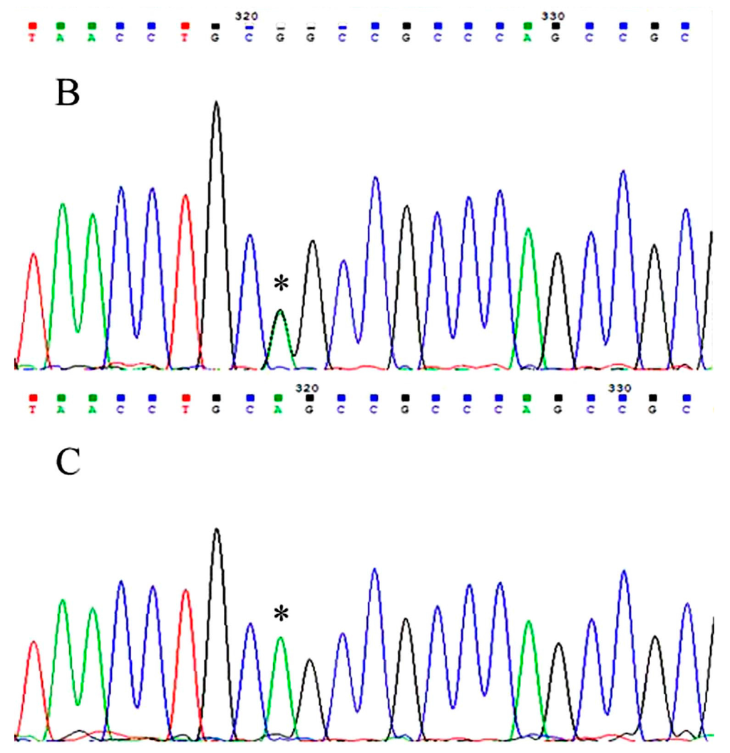 Gene sequence assay indicating LOX G473A polymorphism. GG, the homozygous GG genotype; GA, the heterozygous GA genotype; AA, the homozygous AA genotype. Three genotypes: GG, a black wave in (A); GA, a short black wave overlaid with a shorter green wave in (B); and AA, a green wave in (C) are marked by *.