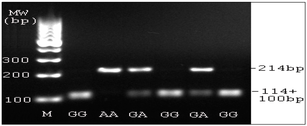 Gene sequencing and polymerase chain reaction (PCR)-restriction fragment length polymorphism (PCR-RFLP) assays were used to assess LOX G473A polymorphism. Genomic DNA was extracted from peripheral blood cells using a commercially available Blood genomic DNA miniprep kit according to the manufacturer’s instructions (ZomanBio, Beijing, China). Amplicons containing the LOX G473A fragment were obtained by PCR with primers: forward (F)-5’-TTCCAAGCTGGCTACTCGAC-3’, reverse (R)-5’-CAGGTCTGGGCCTTTCATAA-3’. The PCRs were performed in a total volume of 25 μL reaction mixture containing 0.1 μg genomic DNA (1 μL), F and R primers each 5 μM (1 μL), 50 mM MgCl2 0.8 μL, Platinum® Taq DNA polymerase (Fermentas, Waltham, MA, USA) 0.2 μL, ddH2O 18 μL, 10 × PCR buffer 2.5 μL, Reactions were conducted using the thermal cycler (Life Tech., Shanghai, China) under the following conditions: an initial incubation 94 °C for 5 min, denature 94 °C for 30 s, annealing 57 °C for 40 s, extension 72 °C for 30 s, 35 cycles, the final extension 72 °C for 5 min, amplified DNA samples stored at 4 °C. The efficiency of the PCR was confirmed by gel electrophoresis on a 1.5% agarose gel. The PCR amplicons were subjected to DNA sequencing using an ABI 3730XL DNA analyzer (Applied Biosystems, Life Tech. Shanghai, China). The sequence data generated was received as colored electropherograms. (Figure 1). Furthermore, PCR-RFLP analysis was performed as described [15] to identify LOX G473A genotypes. The PCR products were digested 4 h at 37 °C with 10U of the specific restriction endonuclease Not I (Life Tech., Shanghai, China), which cut the CG site. The digestion products were then resolved and separated on a 2% agarose gel, stained with ethidium bromide for visualization under ultraviolet light (Figure 2). After electrophoresis, homozygous G alleles which contain the CG site were represented by DNA bands at 100 and 114 bp in length. An uncut fragment of 214 bp indicated the homozygous A alleles and the heterozygous GA genotype was displayed as a combination of 214, 100, and 114 bp bands.