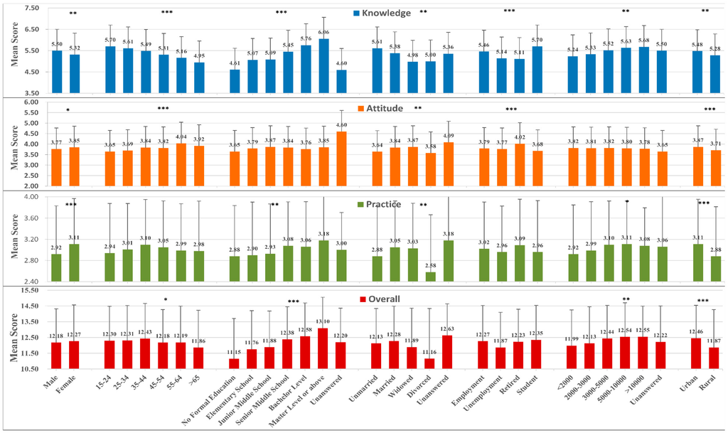 Mean KAP scores according to the demographic characteristics among the participants in Licheng District. * p < 0.05, ** p < 0.01, *** p < 0.001.