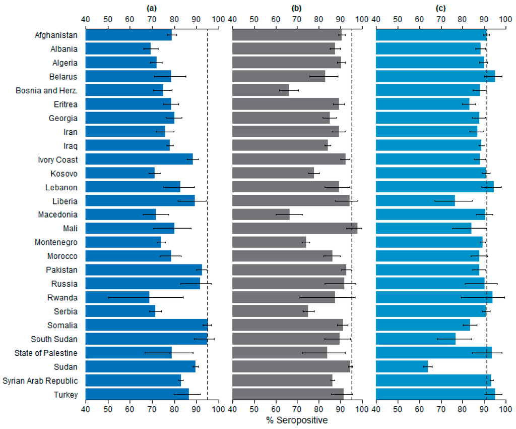 Seroprevalence by country of origin with 95% confidence intervals: (a) Measles; (b) Rubella; (c) Varicella. The dotted lines mark the herd immunity thresholds (95% for measles and rubella, 91% for varicella [8,9,10,11]).