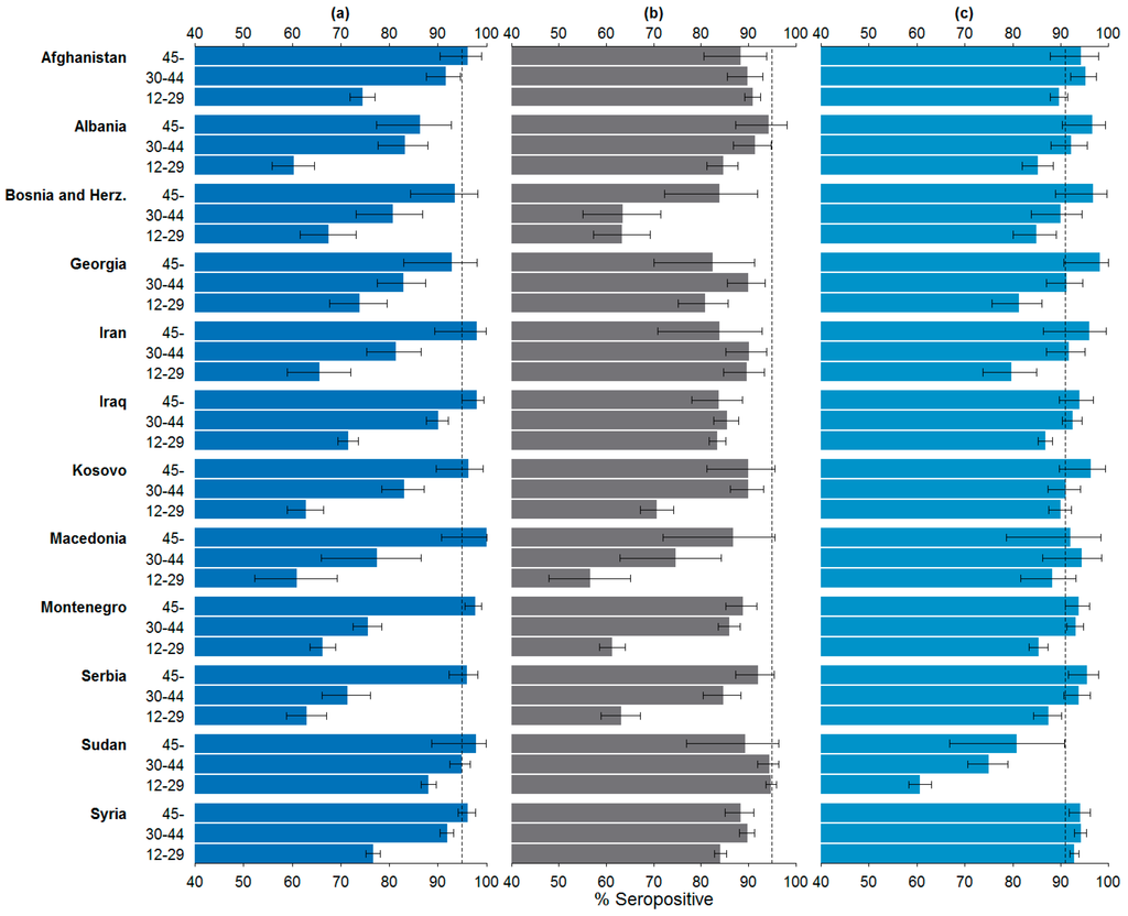 Seroprevalence by country of origin and age group (12–29 years, 30–44 years, 45 years and older) with 95% confidence intervals: (a) Measles; (b) Rubella; (c) Varicella. The dotted lines mark the herd immunity thresholds (95% for measles and rubella, 91% for varicella [8,9,10,11]).