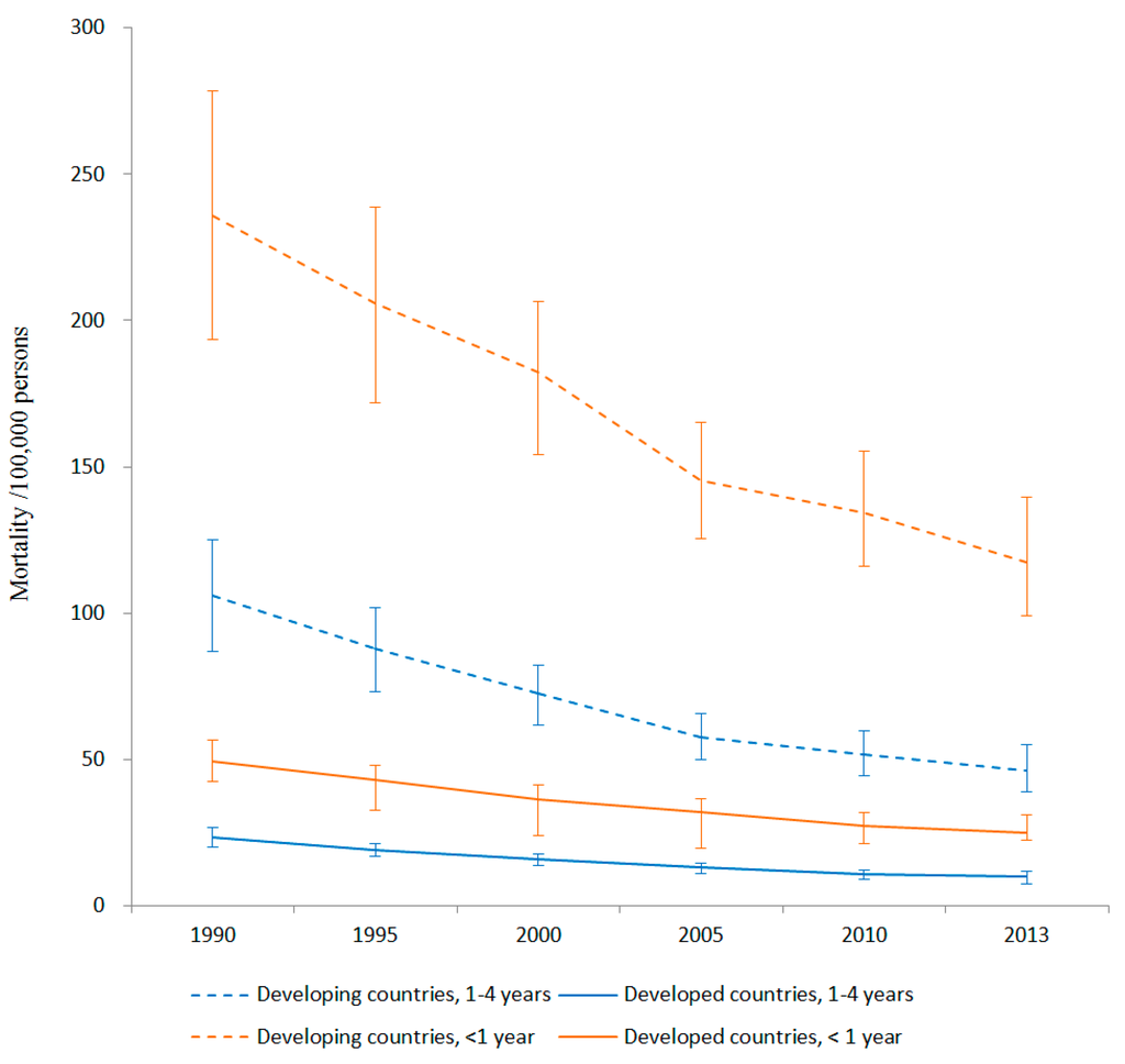 Thus, this study was designed to examine the disparities in injury mortality among children under age 5 in developing and developed countries since 1990 with consideration of differences between infants under age 1 vs. toddlers and preschoolers ages 1–4. We used the online data visualization tool Global Burden of Disease (GBD) Compare to conduct our analysis. Three specific research questions were evaluated: (a) did developing countries experience the same changes in under-five injury mortality as developed countries between 1990 and 2013? (b) did age- and cause-specific child injury mortality rates change equally in the study time period? and (c) within developing countries and within developed countries, did all countries witness equal changes in child injury mortality rate?
