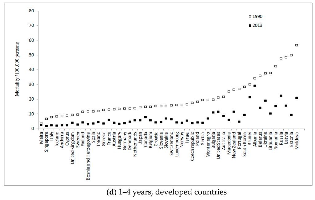 Among children aged 1–4 years, we discovered up to 33-fold differences between Bahrain (5.8 per 100,000 persons) and Equatorial Guinea (189.3 per 100,000 persons) in developing countries, and 15-fold mortality gaps between Singapore (2.0 per 100,000 persons) and Albania (29.3 per 100,000 persons) in developed countries (Figure 3c,d).