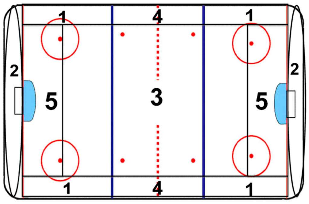 Based on the work of Nadeau and his colleagues [24], Malenfant et al. [14] developed and validated an observation system for recording, quantifying, and qualifying incidences of physical contact during an ice hockey game. This system was used in the present study to analyse 31 games randomly selected. Sixteen games were analyzed for the Calgary group and 15 for the Québec City group. All games were recorded on DVD media and analyzed by research assistants, with inter-judge reliability determined at over 90% for each characteristics of physical contact observed. All research assistants were trained by one of the co-authors (LN) with standardized footage of each categories of physical contact until at least 90% of inter-judge reliability was obtained for all types of physical contact. To make sure that inter-judge reliability was maintained at least at 90% for each research assistant, re-test of inter-judge reliability was made at least two times during the period of video analysis. During the video analyses, the research assistants noted specific characteristics of observed physical contacts (Table 1). To account for the different places where the incidences took place, the skating rink was divided into five zones (see Figure 1). Two main types of body contact could occur: executed with the trunk (i.e., shoulders and hips) or executed with a limb or an object (e.g., arm or ice hockey stick). Each types of contact made with the limbs or an object are different and mutually exclusive categories of contact. In both cases, other contact data were coded. The researchers also noted whether each physical contact was made by an offensive or defensive player, whether on a puck carrier or not, and whether or not it was deliberate. When the body contact involved a limb or object, the researchers noted the limb or object used. The following other types of physical contact were also recorded: pushing, holding, slashing, and tripping. The consequences of the physical contacts (i.e., penalized or not) were not recorded. In fact, a physical contact could be penalized or not, mainly based on the judgement of the referee on how the impact of the contact interfered with the player sustaining it.
