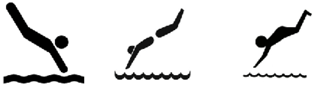 To determine children’s understanding of what constitutes a “dive” they were given a deck of 23 image cards (randomized) and asked to sort these into Diving and Not Diving boxes, as they thought best. The deck comprised 20 colored photos of boys and girls who were in a similar age group to the participants (7–10 years old), with the photos showing individual children either diving in a variety of ways (n = 8, 50% male), jumping in different ways (n = 6, 50% male), or standing (n = 6, 50% male) on a ladder in a pool or lake area. The photos were obtained through an online images search, with similar images included to show boys and girls equally often and in the same situations. In addition to the photos, three clipart images of a figure diving into water were included and randomized within the deck, with different types of dives represented (see Figure 1); these clipart images were chosen to match images commonly depicted on No Diving warning signs.