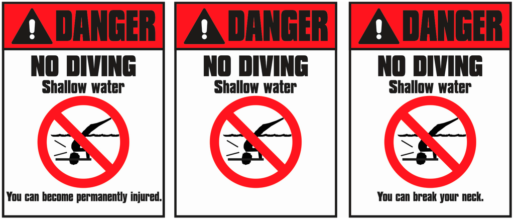 Finally, although this study focused on warning signs, it is not our intention to suggest that this is necessarily the best or only strategy for preventing diving-related injuries. Without doubt, maximizing reductions in these injuries will require a comprehensive and multi-faceted approach. For example, integrating active supervision with signage and enforcement strategies (e.g., penalties for non-compliance with signage or pool rules), and coupling this with environmental modifications (e.g., pool designs) that reduce risk of serious injury or prevent risk behaviors (e.g., designing above-ground pool ladders to prevent diving), addresses many significant risk factors for diving injuries.