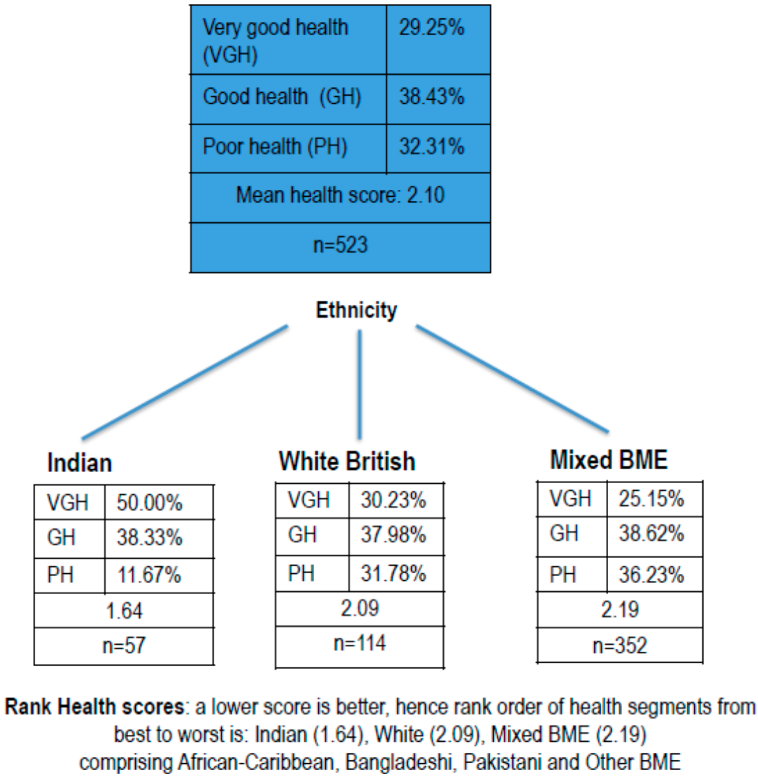 To explore between-group differences in health, we next ran CHAID segmentation analyses using general health (GH) as the dependent variable. As reported above, we used the Decision Tree algorithm (SPSS 18). The first split in the tree node indicates ethnicity as a predictor of general health (GH). The analyses identified three distinct health segments: people of Indian origin, white British, and a single segment combining people of African-Caribbean, Bangladeshi, Pakistani origin and Other BME (see Figure 1 below). This last segment has been labelled “Mixed BME” in the subsequent analysis described below, for ease of reference. In Figure 1, the rank order of health segments (i.e., health score), reading left to right at the lower level, from best to worst health, is Indian (mean GH 1.64), white British (mean GH 2.09), and Mixed BME (mean GH 2.19) (note a lower score indicates better general health).