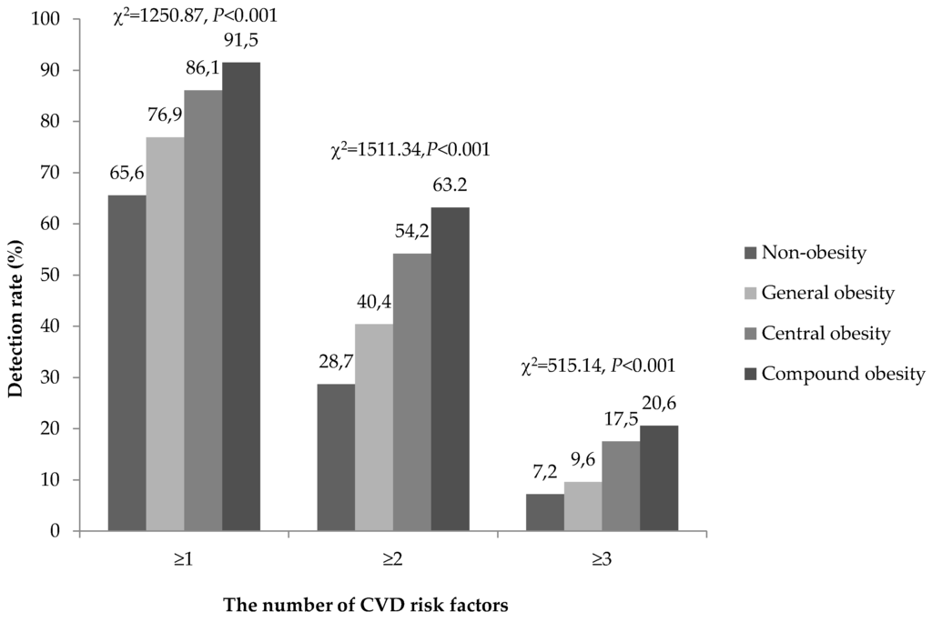 Figure 1 shows that compound obesity group has the highest detection rate of one or more CVD risk factors (non-obesity < general obesity < central obesity < compound obesity). People with obesity were more likely to have one or more CVD risk factors compared with non-obesity subjects (general obesity (OR: 2.27, 95% CI: 1.13–4.56), central obesity (OR: 2.64, 95% CI: 2.41–2.89), compound obesity (OR: 5.09, 95% CI: 4.38–5.90)). The results were similar when the number of CVD risk factors was ≥ 2 and ≥ 3.
