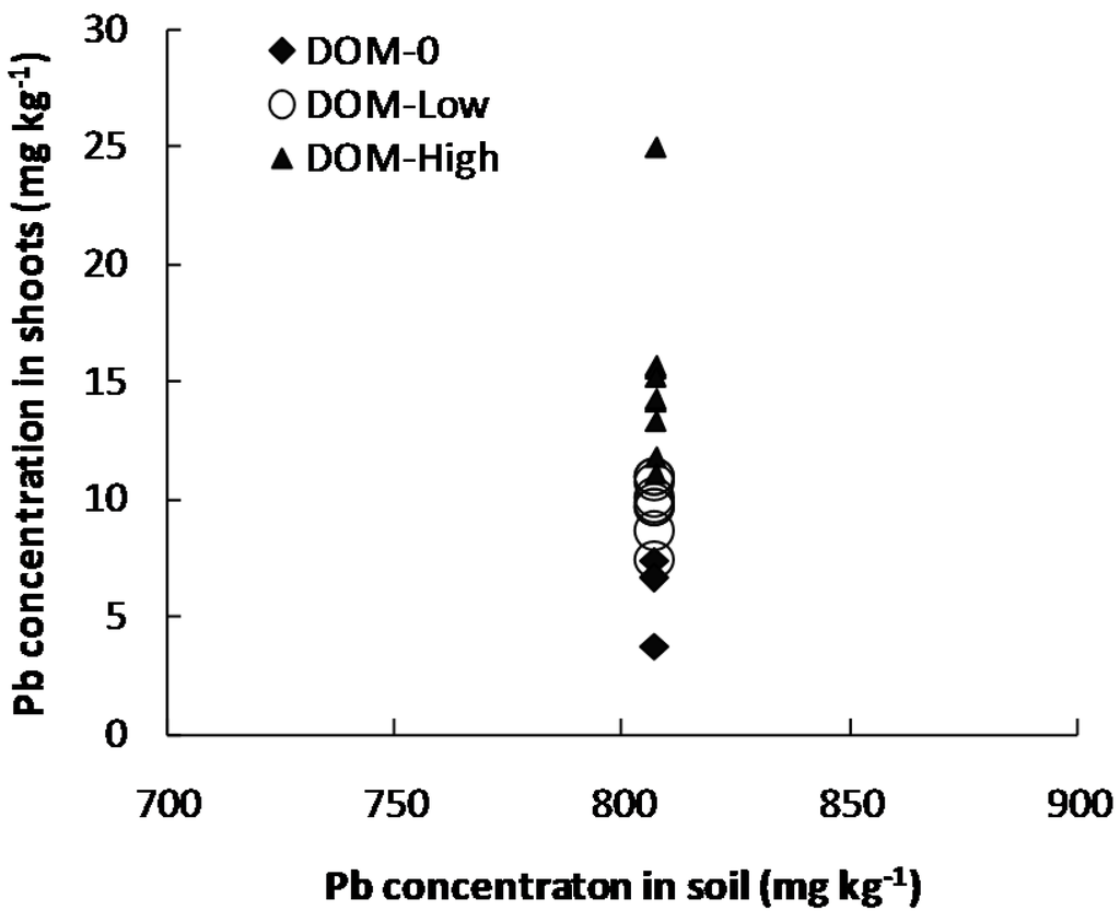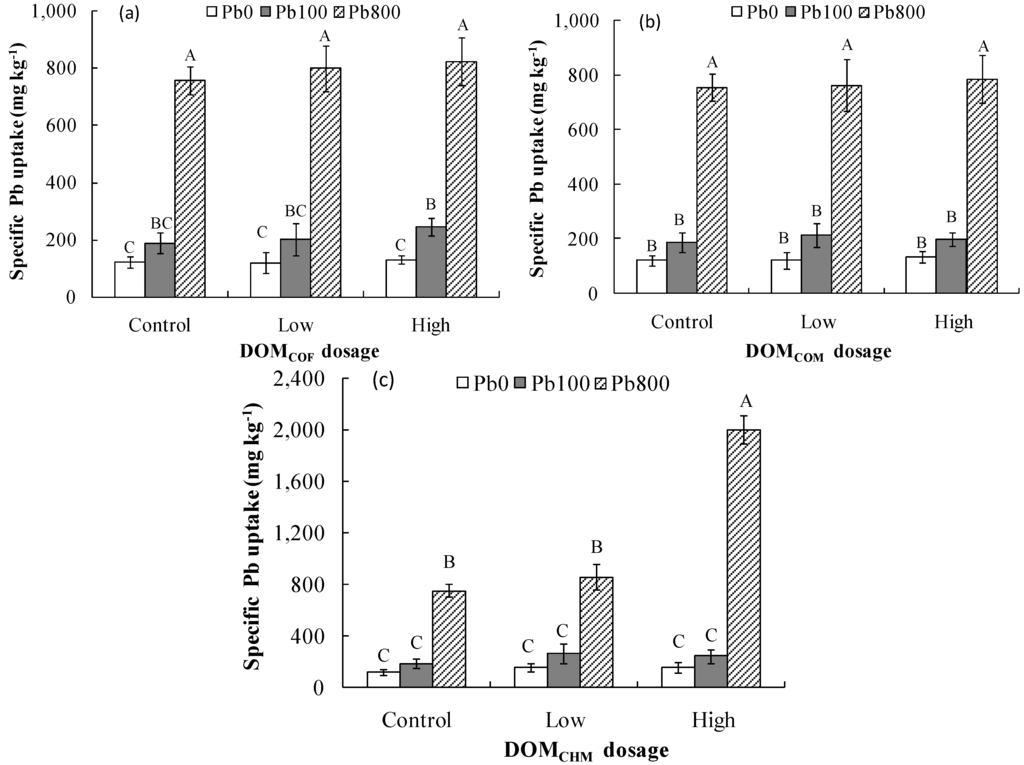 Irrespective of DOM sources, Pb concentrations varied 3.70–7.42 mg·kg−1, 7.34–10.74 mg·kg−1 and 11.06–24.95 mg·kg−1 for DOM-free treatment, low dosage DOM and high dosage DOM, respectively, in shoots (edible parts) of B. chinensis grown in 800 mg·kg−1 soil (Figure 1). This indicated that high dosage DOM treatment increased Pb concentrations in edible part of B. chinensis grown in the soil with high Pb level.