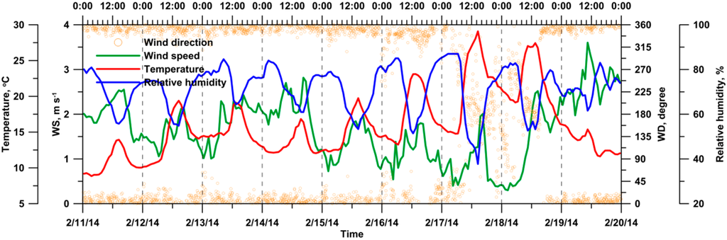 During the whole monitoring period, the hourly average wind speed, temperature, and relative humidity were 1.7 m·s−1, 15.9 °C, and 71.4%, respectively (Figure 2). Despite the irregular wind direction patterns on 17 and 18 February 2014, the principal wind direction was NNW–NNE.