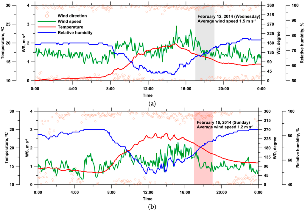 Figure 3 presents the diurnal variation of the 5-min meteorological data at the monitoring site on the reference (12 February 2014) and event (16 February 2014) days. The daily average wind speed, principal wind direction, temperature, and relative humidity were 1.5 m·s−1, NNW–NNE, 14.3 °C, and 68.9%, respectively, on the reference day. On the event day, the daily average wind speed, principal wind direction, temperature, and relative humidity were 1.2 m·s−1, NW–NE, 17.8 °C, and 73.2%, respectively.