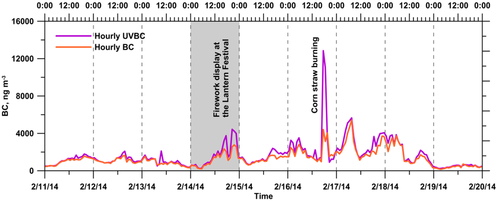 The time variations of hourly UVBC and BC concentrations at the monitoring site during the whole monitoring period were presented in Figure 4. During the whole monitoring period, the hourly average UVBC and BC mass concentrations were 1652 and 1345 ng·m−3, respectively. The interquartile ranges were 799–1921 and 681–1641 ng·m−3 for hourly UVBC and BC mass concentrations, respectively. Despite the firework display on 14 February 2014 and a remarkable corn straw burning on 16 February 2014, the highest daily average BC mass concentration was observed on 17 February 2014, and it was 2540 ng·m−3. This highest daily average BC mass concentration was due to some sporadic agricultural residue burnings at the different upwind sites of the monitoring location.