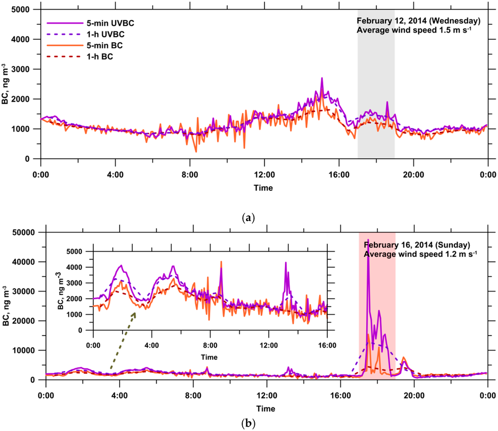 Diurnal variations of 5-min and 1-h UVBC and BC concentrations at the monitoring site on (a) the reference day; and (b) the event day.