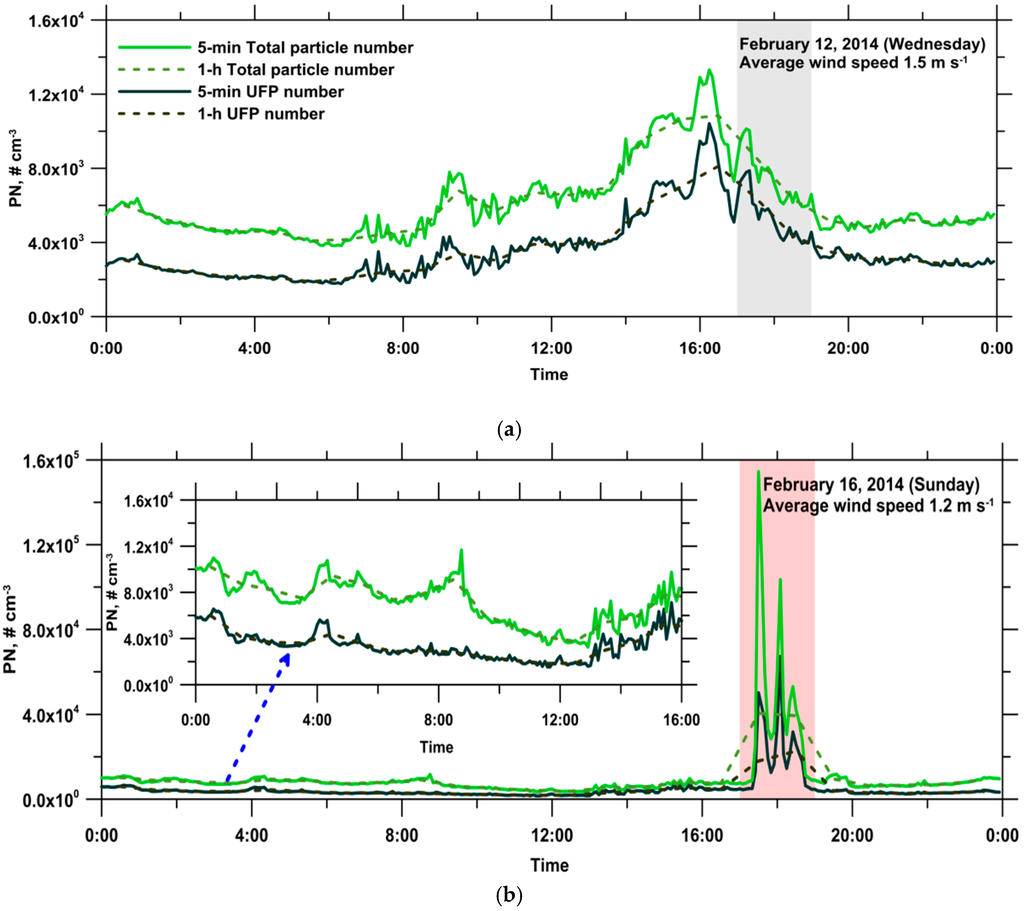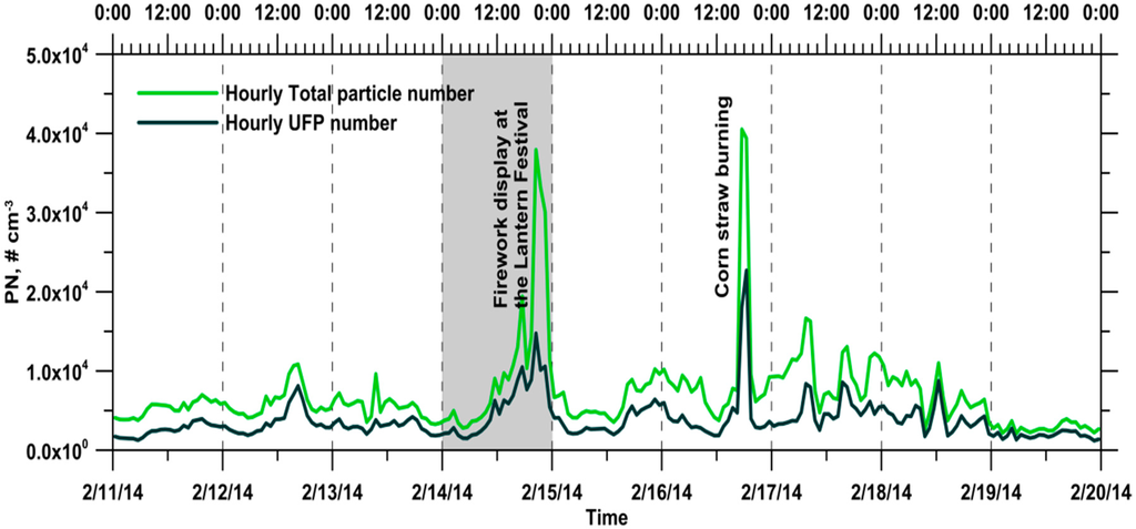In this study, the total particle and UFP number concentrations in the size ranges of 13–750 and 13–100 nm were calculated from the raw data of the SMPS, respectively. During the whole monitoring period, the hourly average total particle and UFP number concentrations were 7.06 × 103 and 3.76 × 103 cm−3, respectively. The interquartile ranges were 4.18 × 103–8.13 × 103 and 2.22 × 103–4.32 × 103 cm−3 for total particle and UFP number concentrations, respectively (Figure 6). The highest daily average total particle and UFP number concentrations were observed on 14 February 2014, and they were 1.08 × 104 and 5.50 × 103 cm−3, respectively, corresponding to the firework display. The lowest daily average total particle and UFP number concentrations were observed on 19 February 2014 due to its highest daily average wind speed and they were only 2.84 × 103 and 1.88 × 103 cm−3, respectively. The UFP number concentrations at the rural area considered in the current study were remarkably lower than those in urban areas, which have been determined in past studies [29,30,31,32,33,34].