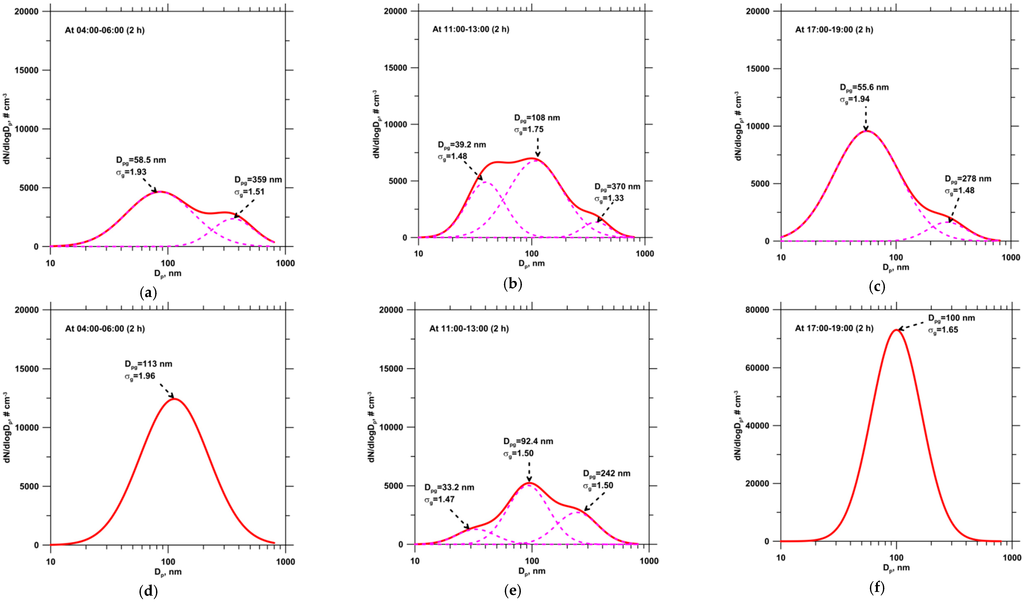 Average particle number size distributions measured on reference day during (a) predawn hours; (b) midday hours; and (c) evening hours; and on event day during (d) predawn hours; (e) midday hours; and (f) evening hours.