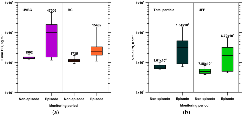 Five-minute concentration levels of (a) UVBC and BC; and (b) total particle and UFP during the non-episode and episode periods. The box and whisker plot show the lowest, lower quartile, median, upper quartile, and maximum values.