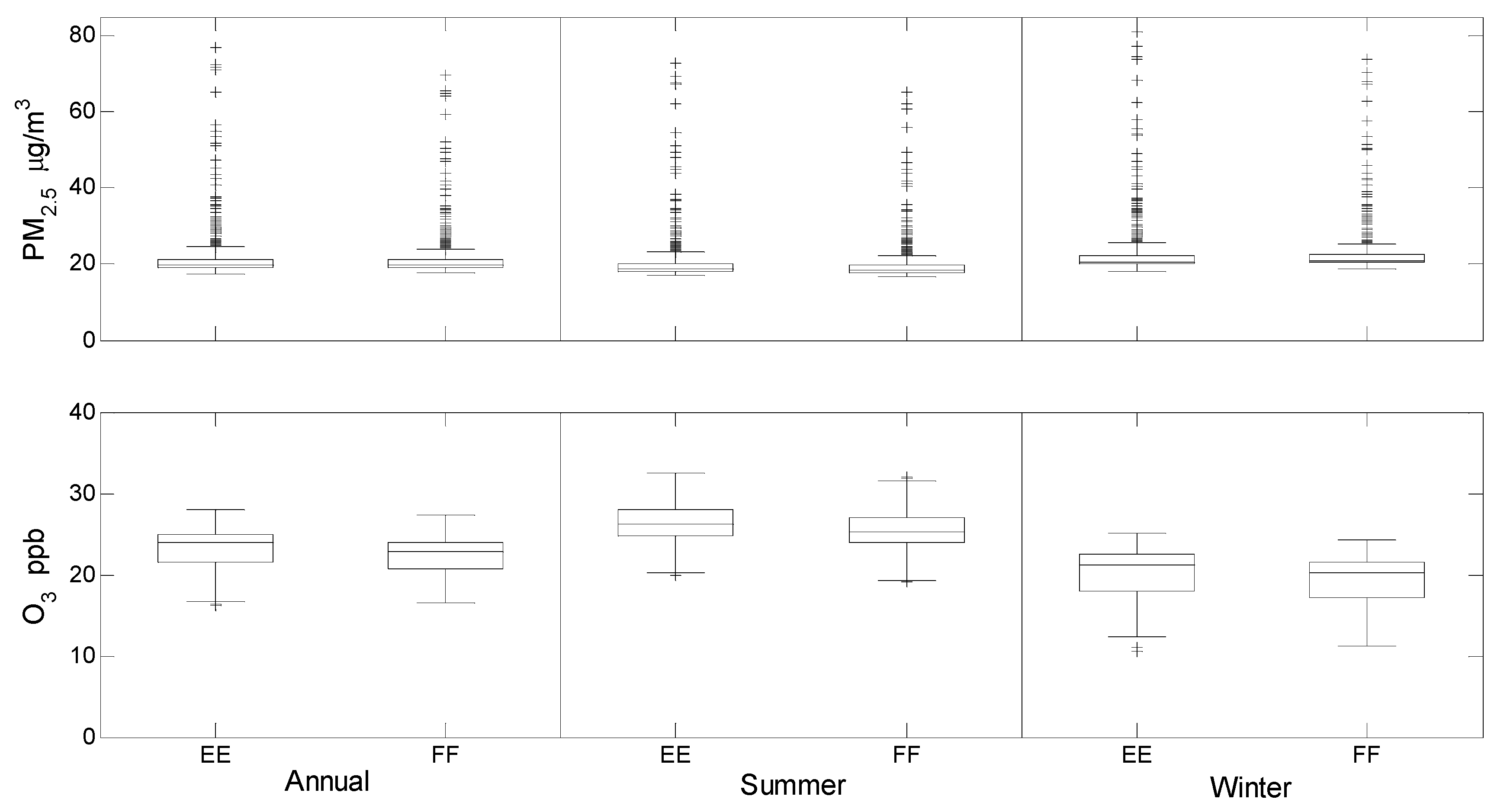 Boxplots summarizing annual, warm and cold season concentrations of fine particulate matter (PM2.5) and ozone (O3) in the 645 municipalities of São Paulo State in the Ethanol Expansion (EE) and Fossil Fuel (FF) scenarios.