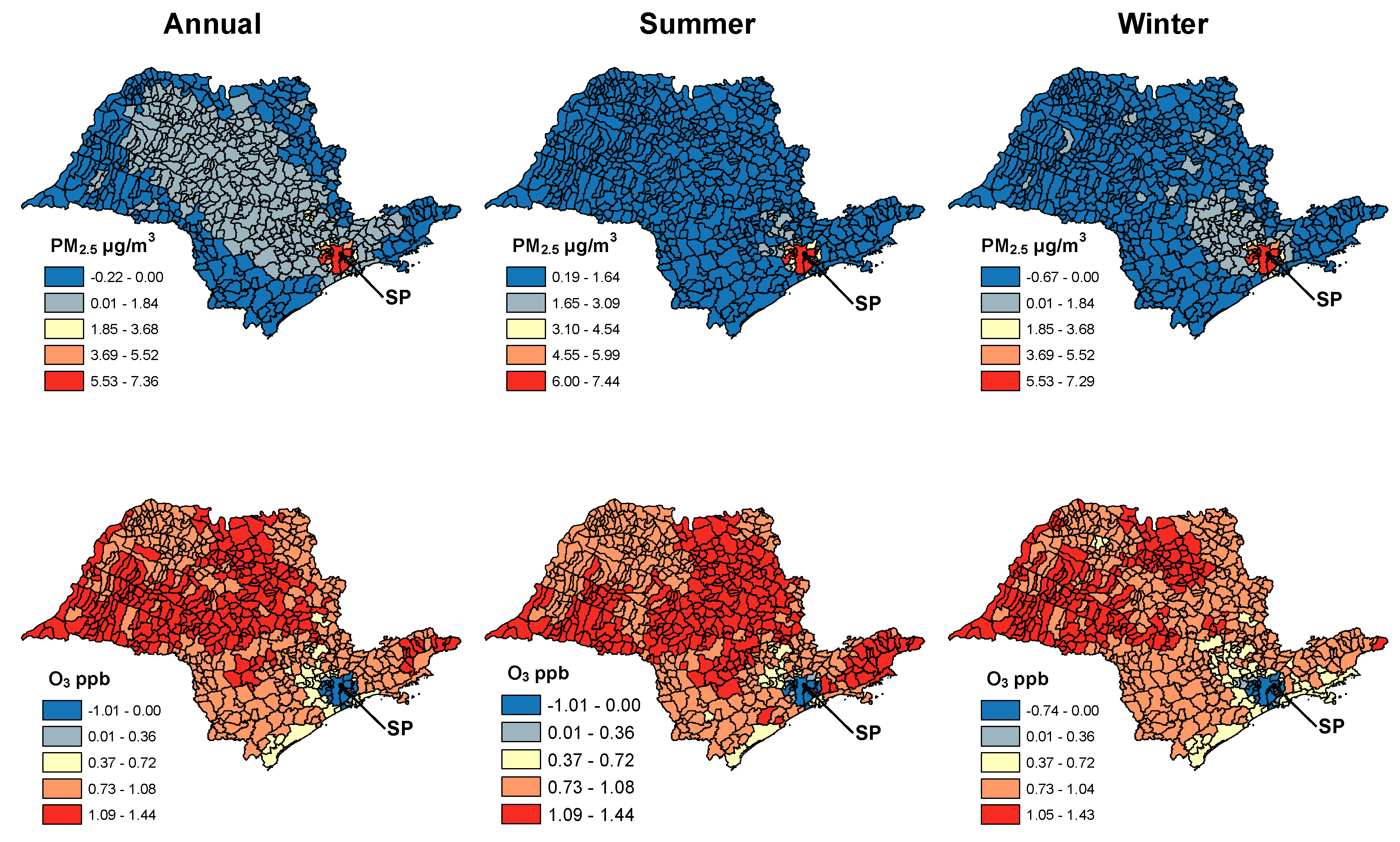 Difference in the concentration of fine particulate matter (PM2.5) (average) and ozone (O3) (average of 1 h maximums) in each of the 645 municipalities of São Paulo State. Positive values indicate higher concentrations in the Ethanol Expansion scenario.