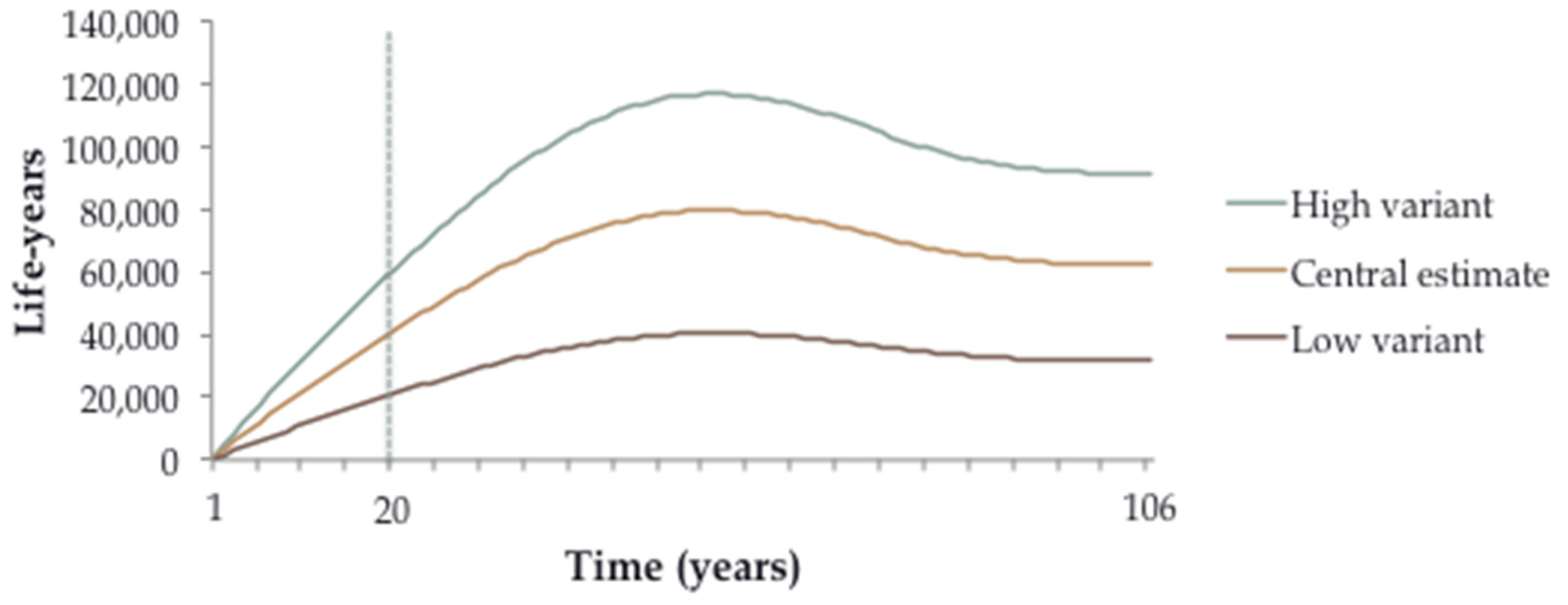 Figure 4 projects impacts over the whole 106-year follow-up period, assuming that the differences in air quality are sustained throughout. Benefits continue to accrue to a maximum impact of ~80,000 life-years per year is gained after about 55 years of follow-up. Impacts then decrease slightly to ~60,000 per year and level off. For context, the birth cohort experiencing these reduced risks would have an increased life expectancy of approximately four weeks.