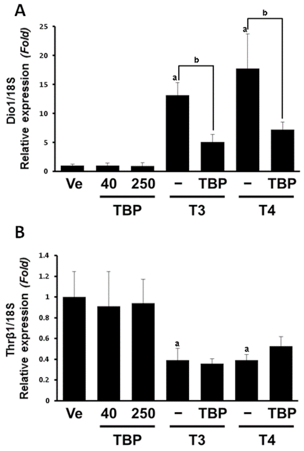 Expression levels of Dio1 (A) and Thrβ1 (B) mRNA in liver. Results presented in the bar graph are divided according to chemical administered and subdivided according to the presence or absence of 2,4,6-tribromophenol. Ve, vehicle; T3, triiodothyronine; T4, thyroxine; TBP, 2,4,6-tribromophenol. a p < 0.05 versus vehicle, b p < 0.05 versus without TBP. Data are presented as the mean ± SD.