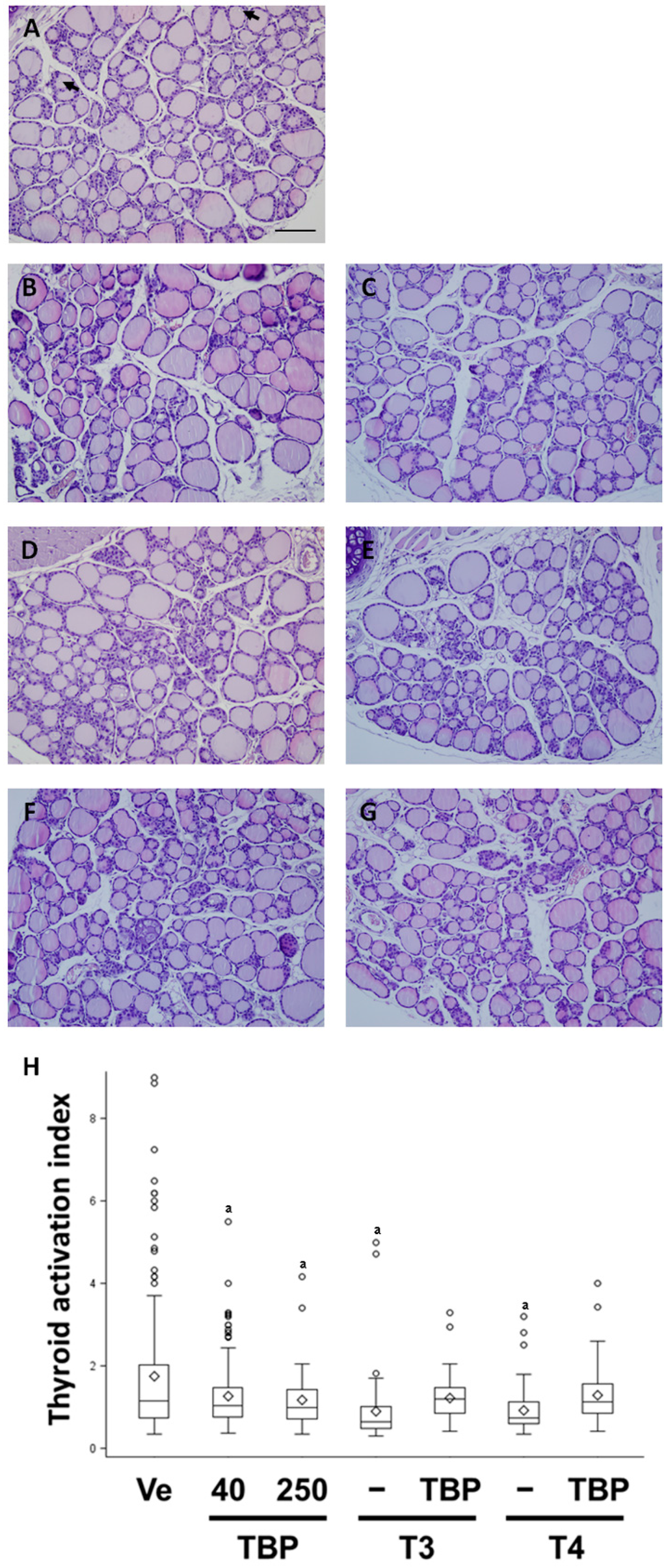 Thyroid gland histology ((A) Ve; (B) TBP 40; (C) TBP 250; (D) T3; (E) TBP-T3; (F) T4; (G) TBP-T4) and thyroid gland activation index (H). Arrow indicates resorption lacunae of follicle. Each thyroid gland was pictured at 200× magnification. Scale bar represents 100 μm. Results presented in the box and whisker graph are divided according to chemical administered and subdivided according to the presence or absence of 2,4,6-tribromophenol. Ve, vehicle; T3, triiodothyronine; T4, thyroxine; TBP, 2,4,6-tribromophenol. a p < 0.05 versus vehicle, b p < 0.05 versus without TBP. Data are presented as the 1.5 interquartile range, mean (diamond) and outlier (circle).