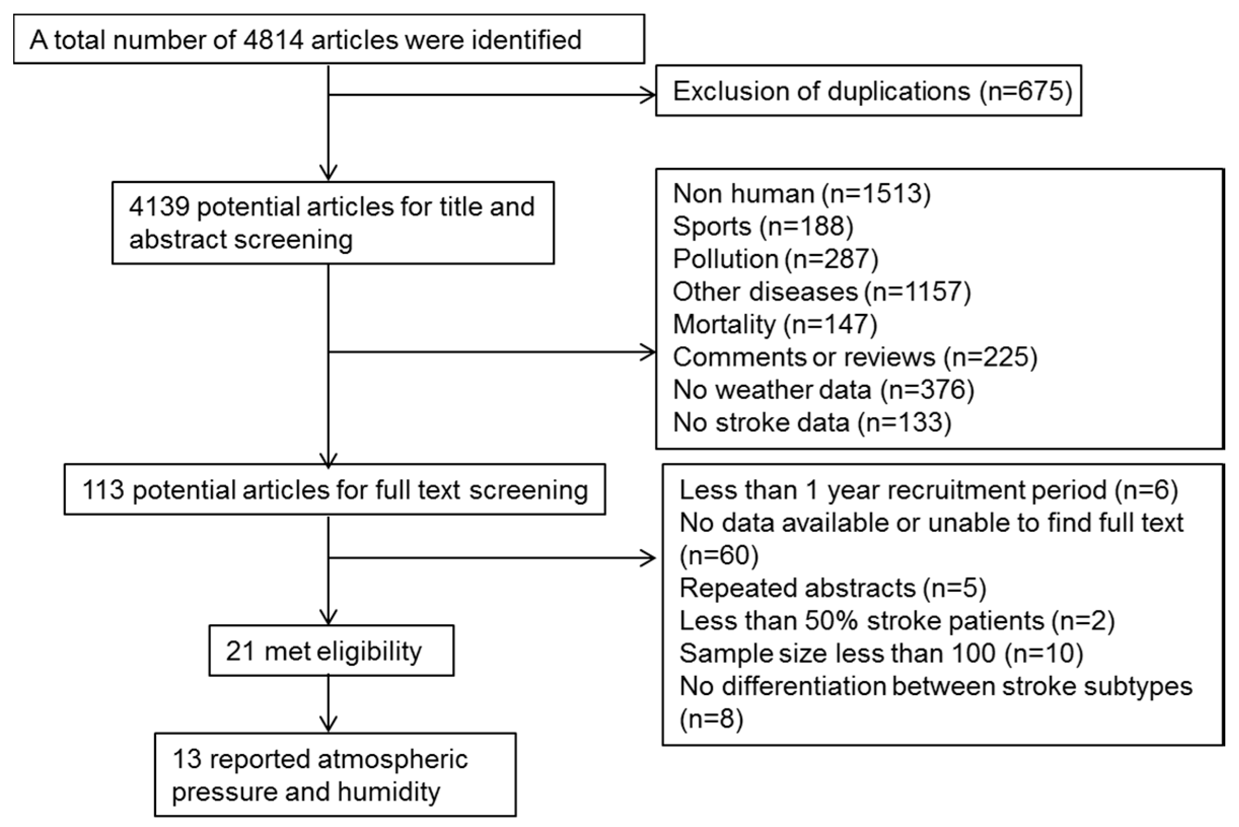 Population or community-based, and hospital registry studies that explicitly stated consecutive patient recruitment from within clearly defined geographical boundaries and of a minimum one-year duration (to ensure all seasons were represented) were included. Patients aged 18 years and over, of any race or gender with a clinical or imaging (computed tomography [CT] or magnetic resonance imaging [MRI]) diagnosis of first-ever or recurrent stroke, regardless of pathological subtype, were included. Hospital-based studies and studies with broad vascular outcomes, no specific results for stroke, with less than 50% stroke patients, or with fewer than 100 patients were excluded. In addition, studies that cited on weather data from unofficial sources (e.g., any temperature website) were excluded.