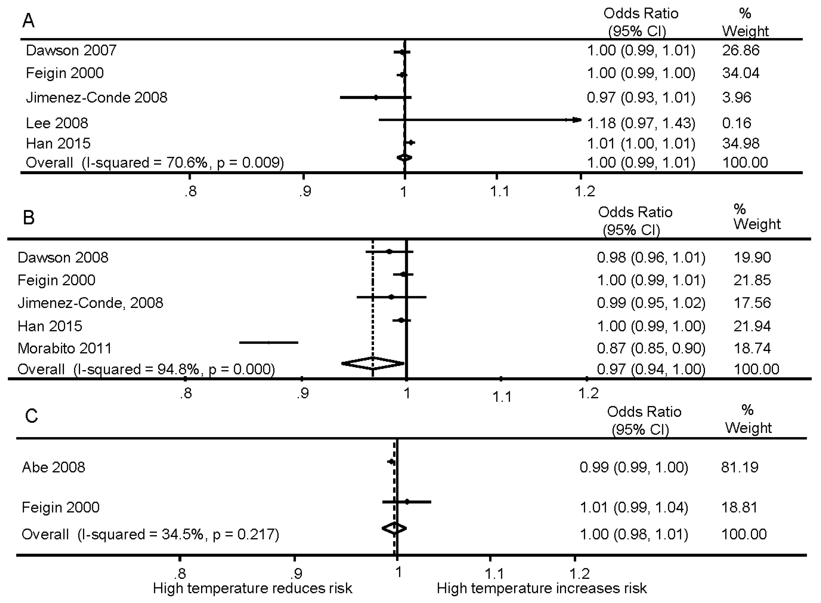 Meta-analysis of ambient mean temperature and stroke: (A) ischemic stroke; (B) intracerebral haemorrhage; (C) subarchnoid haemorrhage.