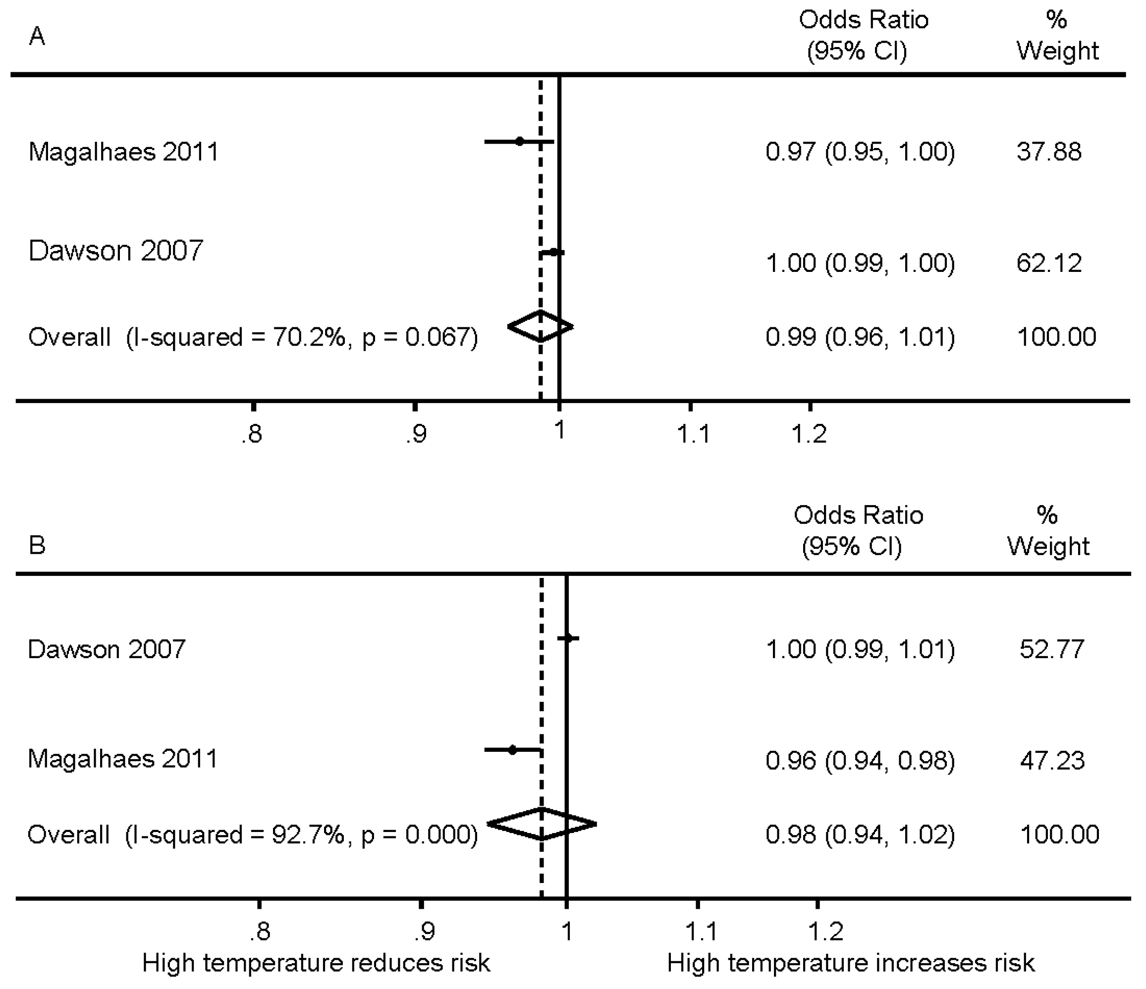Meta-analysis of ambient temperature and ischemic stroke: (A) daily minimum temperature; (B) daily maximum temperature.