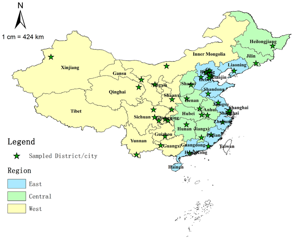 Map of China showing the East, Central, and West regions and sampled districts/cities. Notes: the three regions (East, Central, and West) were categorized according to the China Health and Family Planning Yearbook [22].