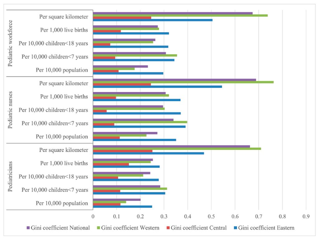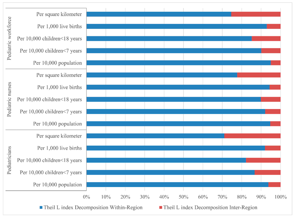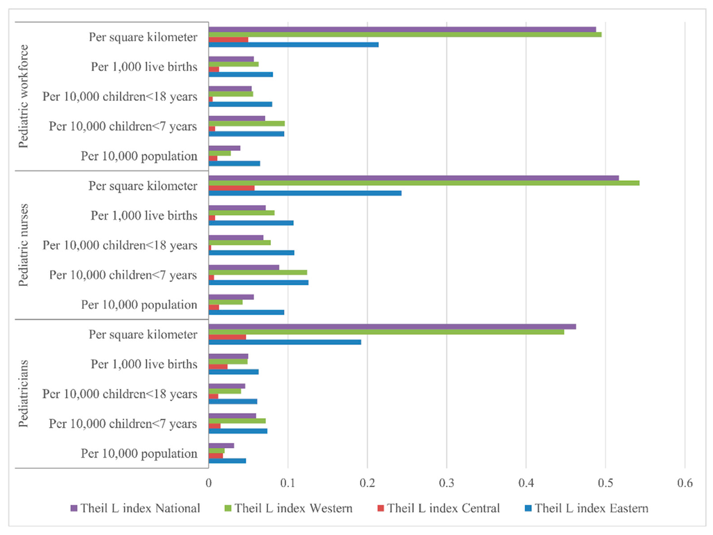 As is well known, overall inequality can be divided into the inner-group and inter-group inequality, the decomposition of inequality can be used as the first step to identify the proximate sources of inequality [25,36]. In this study, the moderately-developing Central region was found to be more equitable than the West and the East regions regarding both the demographic and geographic distributions of the paediatric workforce. This may indicate the severe inner-regional unreasonable allocation of paediatric resources within the regions [37]. In the West region, the paediatric workforce showed the highest inequality regarding the distribution of children <7 years and geography. This might be associated with the low economic development in these provinces [37]. By Theil L decomposition, this study shows that the inner-regional inequality was the main source of the paediatric workforce distribution inequality. This disparity may stem from the development inequality and related health policy within each region, and more policy attention should be paid to the inequality locally. The proportion of inter-regional inequality of paediatric nurse distribution was larger than that of paediatrician distribution, both demographically and geographically; equalization of paediatric nurses should receive greater priority across the three regions.