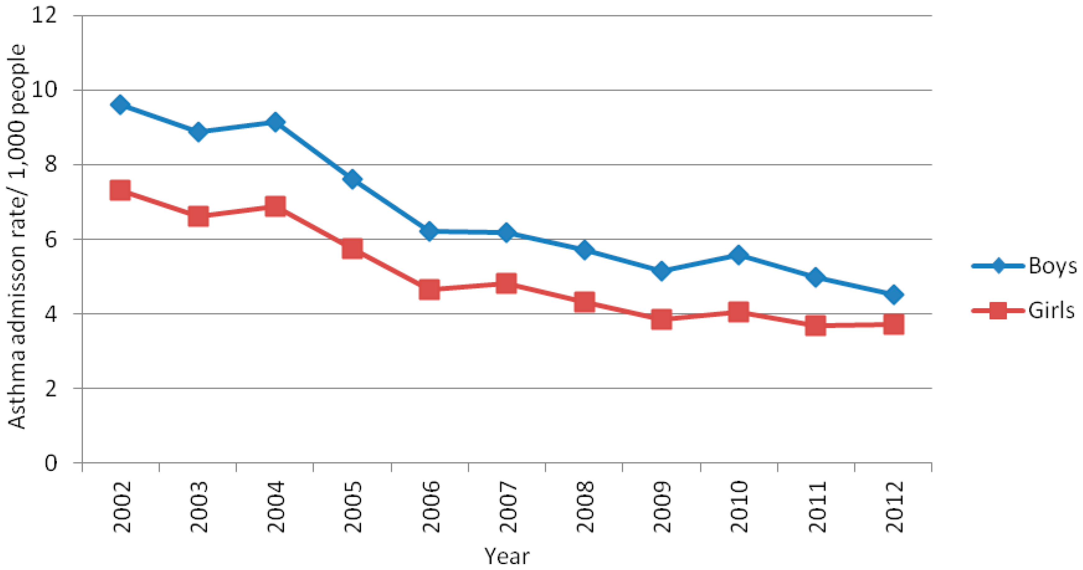 In Belo Horizonte, there were 36.975 asthma-related hospitalizations from 2002 to 2012 across all age groups, 89% of which were among children aged 0 to 14 years, totalizing 32,978 childhood hospitalizations (Table 1). The number of hospitalizations was highest in the 0–4 year age group across years and 35% higher in boys than in girls across age groups (Table 1). Moreover, hospitalization rates were higher in boys than in girls across years (Figure 1).