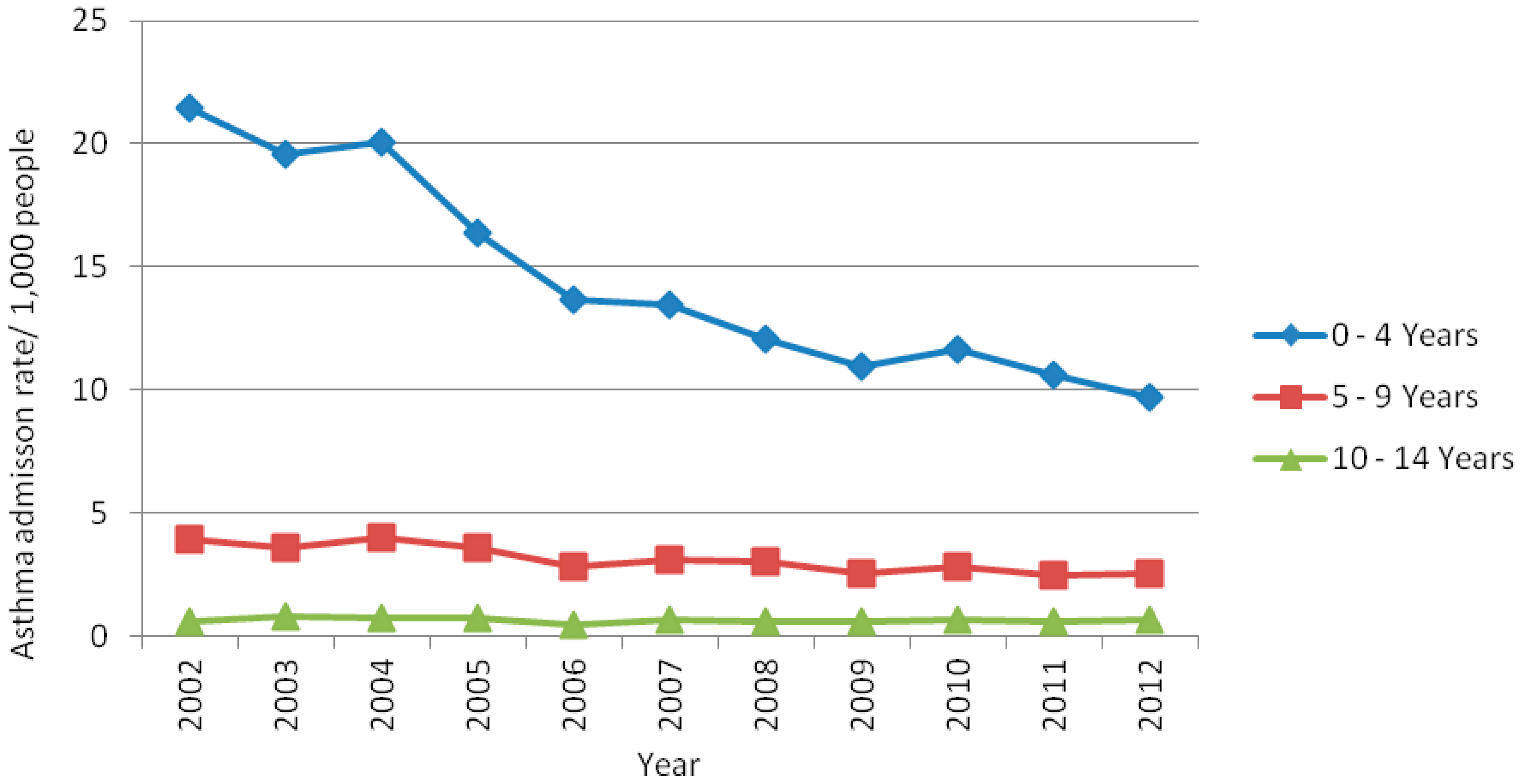 Asthma-related hospitalization rates were significantly different (p ≤ 0.05) across age groups and there was a decreasing trend in hospitalization rates over the 11-year study period. Specifically, hospitalization frequency declined by approximately 55% and 36% in the 0–4 and 5–9 year age groups, respectively. Conversely, ARHR in the 10–14 year age group were stable from 2002 to 2012 (Figure 2).