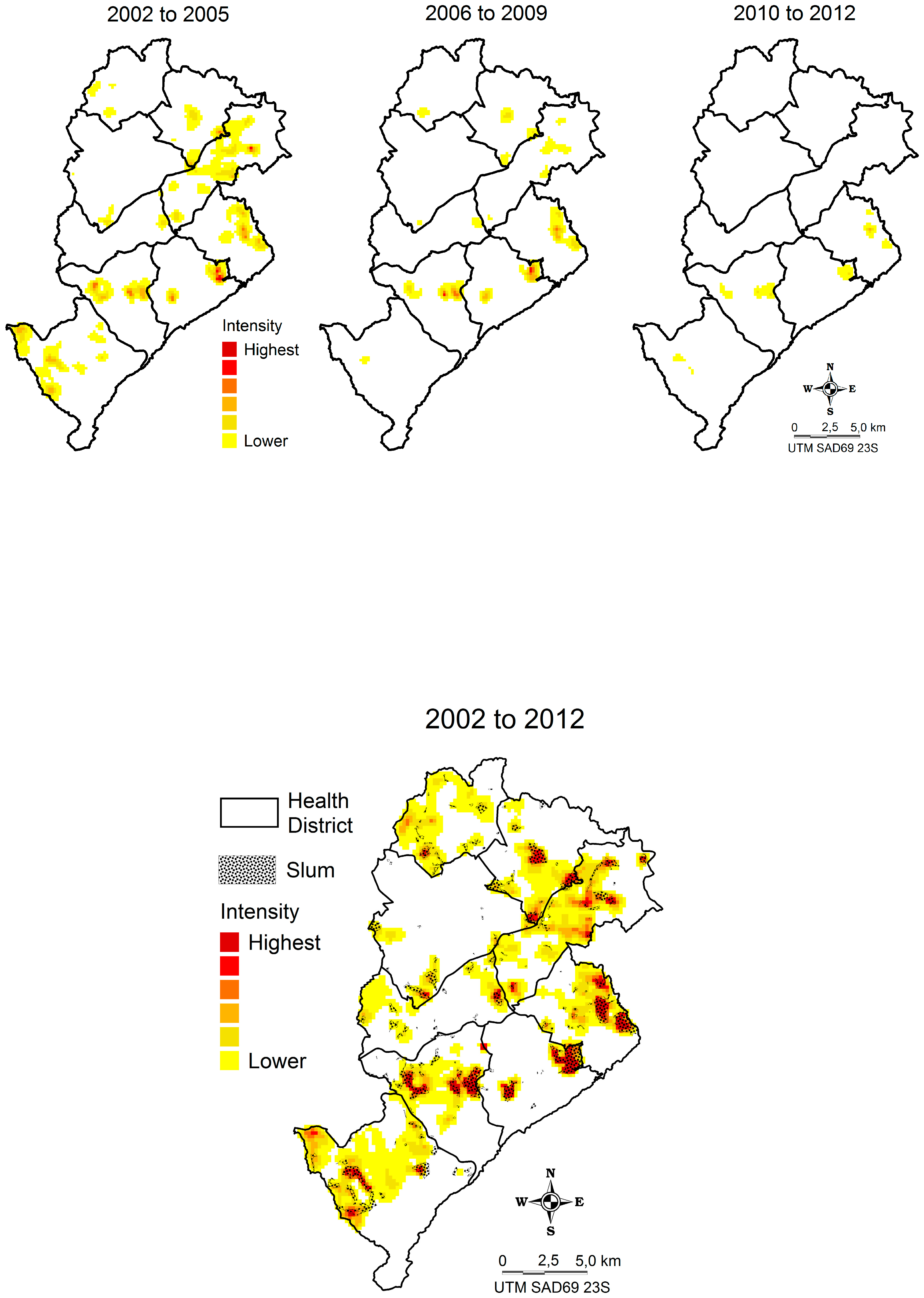 The descriptive analysis was done using Statistical Package for the Social Sciences (SPSS®) version 22.0 (IBM Corp.: Armonk, NY, USA). Residence addresses were geocoded using SISGEOW software (Municipal Health Department, Belo Horizonte, Minas Gerais, Brazil). Kernel analysis was carried out using CrimeStat (Ned Levine & Associates, Houston, TX, USA and the National Institute of Justice, Washington, DC, USA) and maps were constructed using MapInfo 10 (MapInfo Corporation, North Greenbush, NY, USA), whereas the time series analysis was conducted using R software (Free Software Foundation’s GNU project, Auckland, New Zealand). This study was part of a project named the Health of Residents in Special Areas of Social Interest and was approved by the research ethics committee at the Health Department of Belo Horizonte Municipality and Federal University of Minas Gerais under the respective protocol number CAAE 11548913.3.0000.5149.
