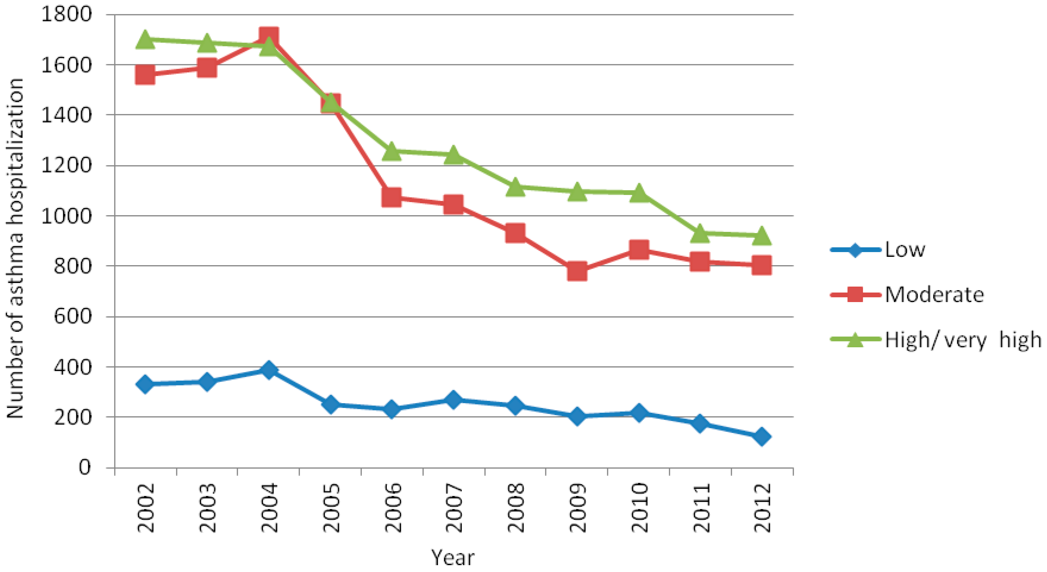 The hospitalization rates for asthma in children and adolescents for the low, medium and high/very high risk areas were, respectively, 3.4, 12.5 and 19.6 per 1000 people, in 2002. In 2012, they were 1.7, 9.0 and 15.3, respectively.