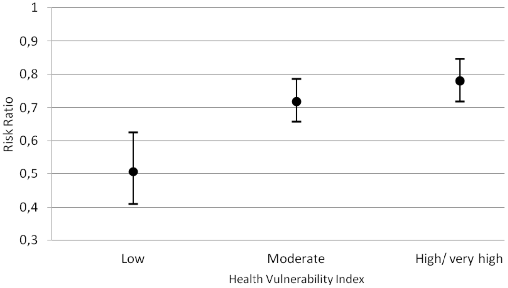 Comparing to the rates in 2002 the hospitalization ratio for children/adolescents living in HVI low risk areas reduced by 50% in 2012 (RR: 0.50; 95% CI 0.40 to 0.63). For the medium HVI and high/very high risk areas the reduction was 28% (RR: 0.72; 95% CI 0.66 to 0.79) and 22% respectively (RR: 0.78; 95% CI 0.72 to 0.85) (Figure 5).