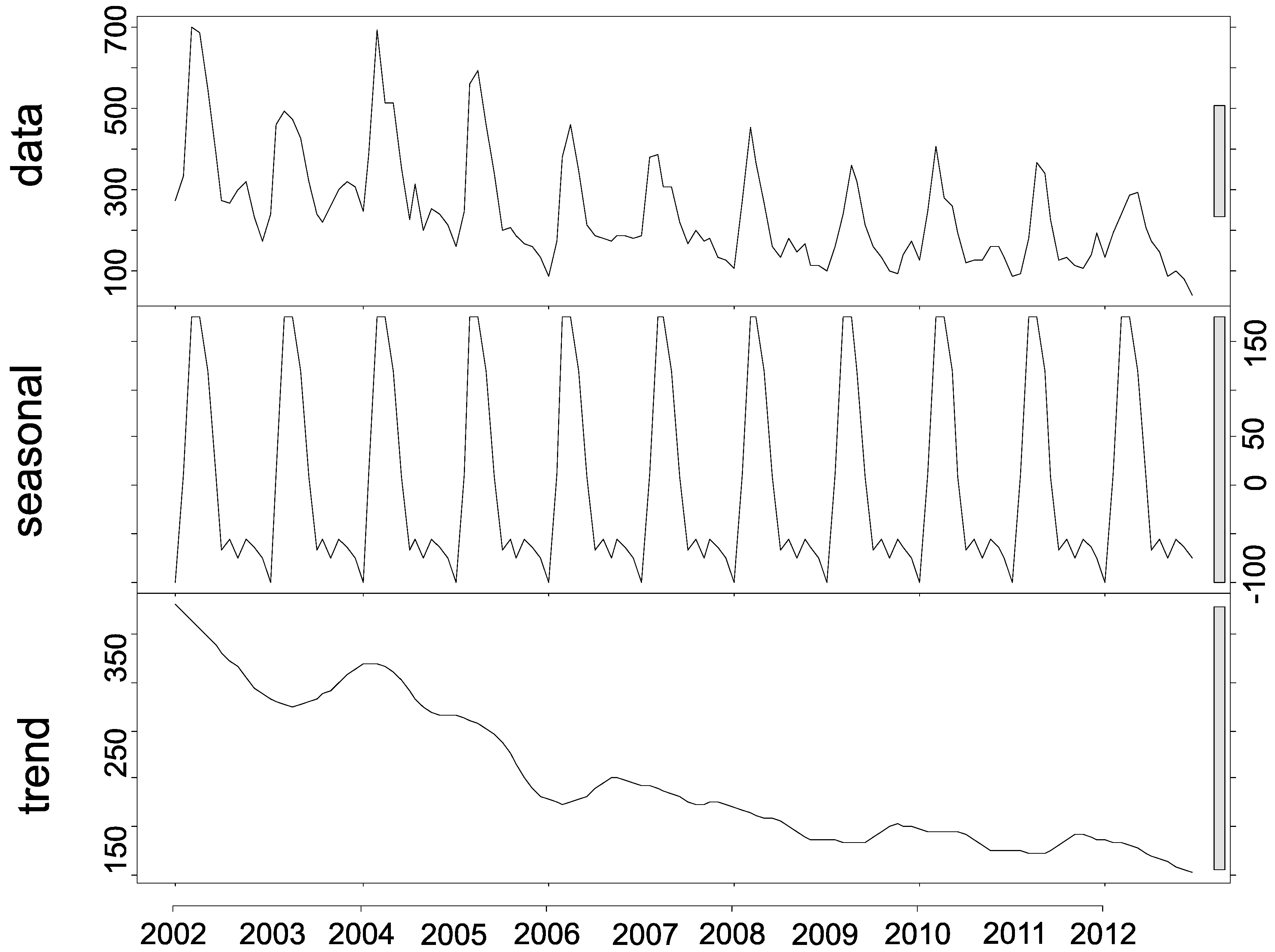 Seasonal decomposition of frequency of asthma hospitalizations in children and adolescents aged 0–14 years in Belo Horizonte, Minas Gerais, Brazil, 2002–2012.