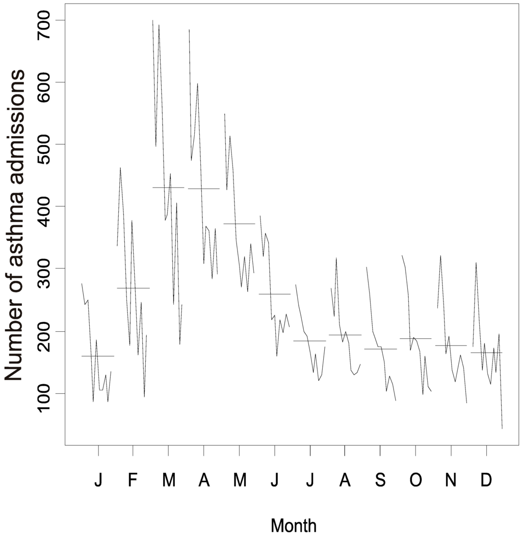 A time-series plot with seasonal decomposition was constructed for the analysis of time trends in asthma-related hospitalizations [23].