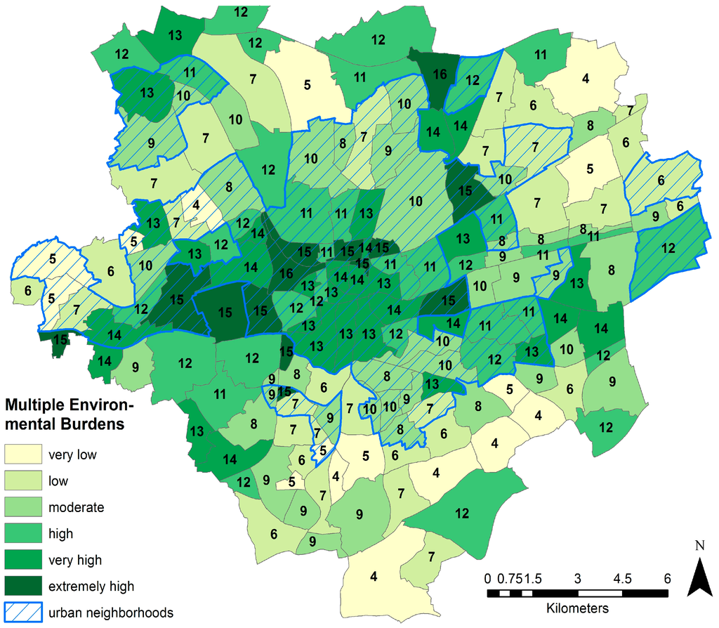 Areas of multiple burdens are neighborhoods where the majority of environmental factors included in the study score high. Figure 4 shows the combination of the four selected environmental indicators. The factor green, being shown above as an environmental benefit, is used here in reverse order indicating a neighborhood of high availability of green with a score of four. The results show that the neighborhoods north of the CBD have the highest levels of multiple environmental burdens, together with the industrialized area west of the city. The neighborhoods scoring highest northeast of the inner city are all areas highly affected by motorized transport.