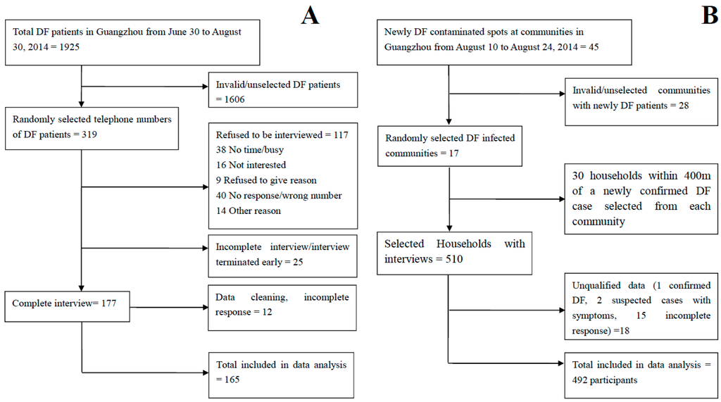 Flow charts for the recruitment of cases and controls to determine populations vulnerable to Dengue Fever infection in the 2014 Guangzhou outbreak. (A) Flowchart for telephone surveys conducted with dengue fever (DF) cases; (B) Flowchart for face-to-face interviews of controls conducted at 17 local communities.