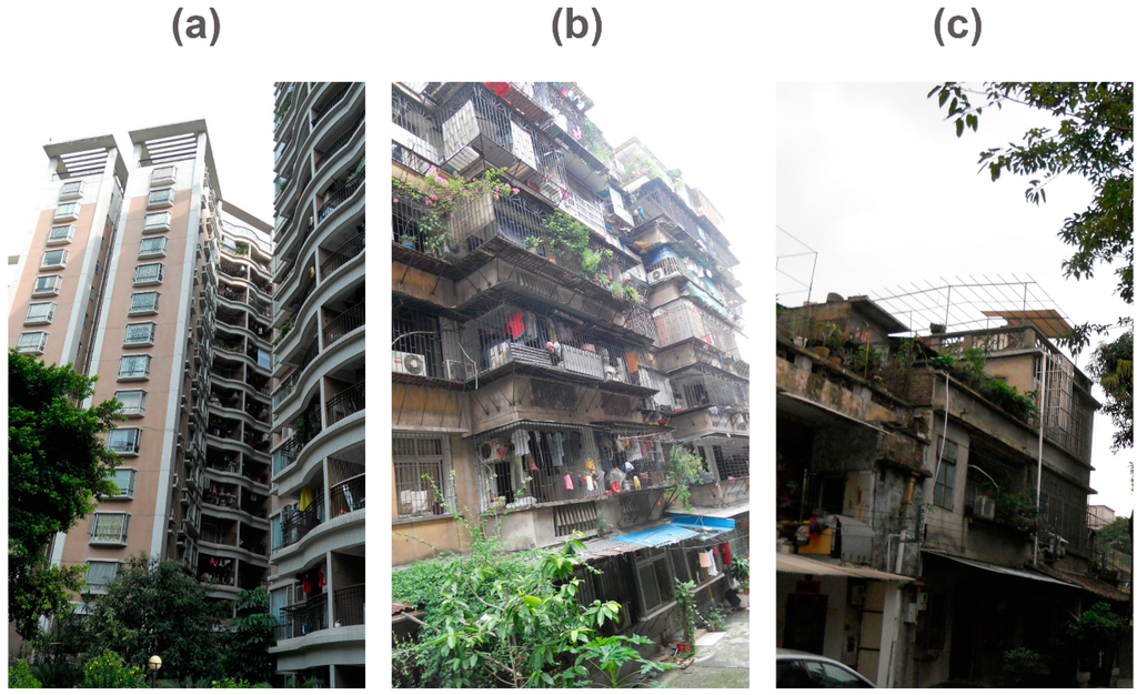 Types of residential buildings in the 2014 Guangzhou outbreak (from left to right: (a) high-rise modern apartment; (b) old flat; (c) shed).