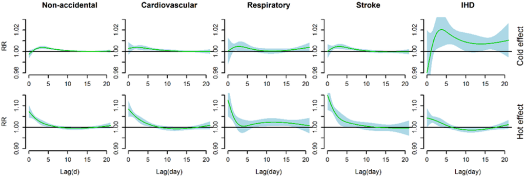 We calculated the cumulative effects of mean temperature on cause-specific mortality at different amounts of lag (Table 5). For cold effects over a lag of 0–21 days, a 1 °C decrease in mean temperature below the cold thresholds was associated with a 2.39% (95% CI: 1.71, 3.08) increase in non-accidental mortality, 3.65% (95% CI: 2.62, 4.69) increase in cardiovascular mortality, 3.87% (95% CI: 1.57, 6.22) increase in respiratory mortality, 3.13% (95% CI: 1.88, 4.38) increase in stroke mortality, and 21.57% (95% CI: 12.59, 31.26) increase in IHD mortality. For hot effects over lag 0–7 days, a 1 °C increase in mean temperature above the hot thresholds was associated with a 25.18% (95% CI: 18.74, 31.96) increase in non-accidental mortality, 34.10% (95% CI: 25.63, 43.16) increase in cardiovascular mortality, 24.27% (95% CI: 7.55, 43.59) increase in respiratory mortality, 59.1% (95% CI: 41.81, 78.5) increase in stroke mortality, and 17.00% (95% CI: 7.91, 26.87) increase in IHD mortality. Hot effects over lag of different days were much greater than cold effects consistently except for IHD mortality at lags of longer than 14 days.