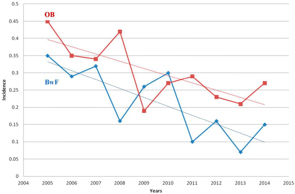 | Year | No. Children with Fever Discharged from PER | OB | BwF | ||