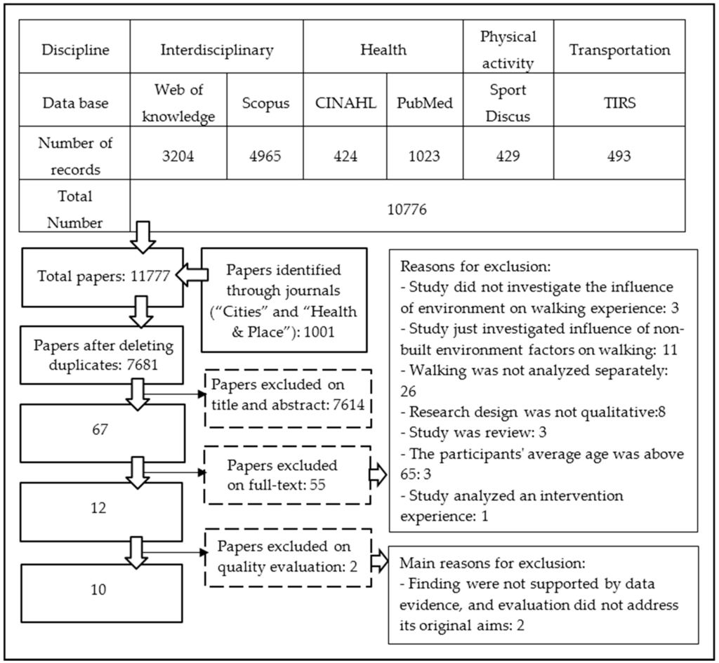 The present study is a systematic review of qualitative studies that explores the influence of the environment on walking separately from other physical activities or modes of transportation. The purposes of this systematic review is to identify the environmental factors influencing walking and understand how they impact on walking based on the experiences of adults. Since the environmental requirements of adults differ from those of children and adolescents [], only adults between the ages of 18 and 65 were examined.